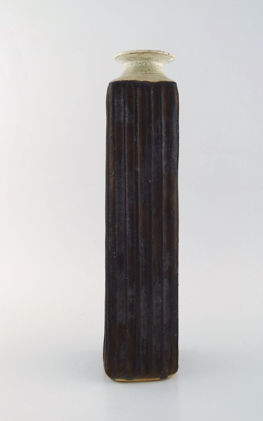Dansk keramiker. Stor unika vase i glaseret keramik. Gutte stil. Rakubrændt teknik. 1960'erne. Måler: 38 x 11 cm. I flot stand. Signeret og dateret.