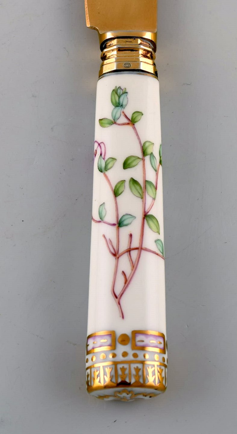 Michelsen for Royal Copenhagen. "Flora Danica" middagssæt bestående af middagskniv, middagsgaffel og spiseske i forgyldt sterlingsølv. Skafte af porcelæn dekoreret i farver og guld med blomster.