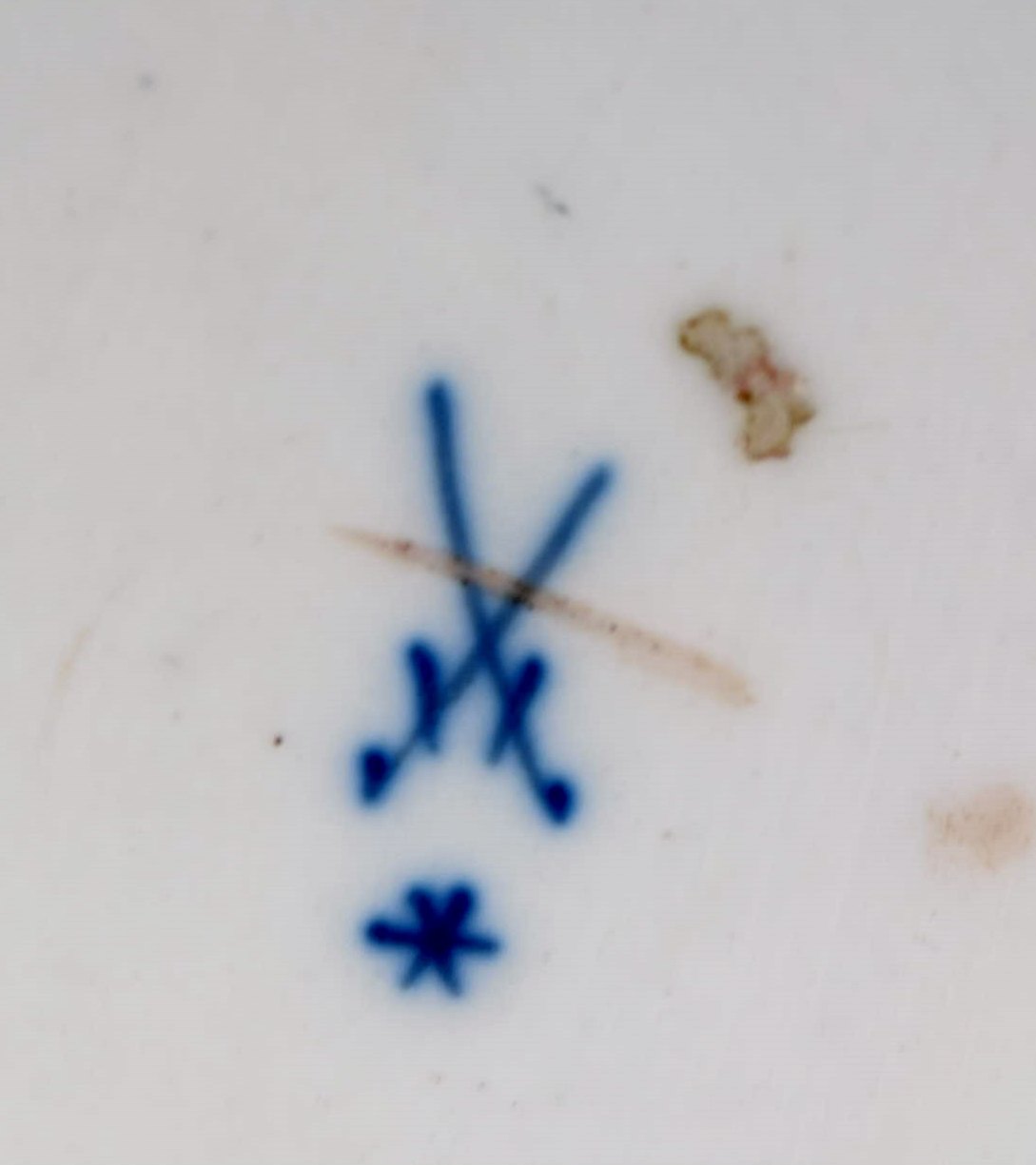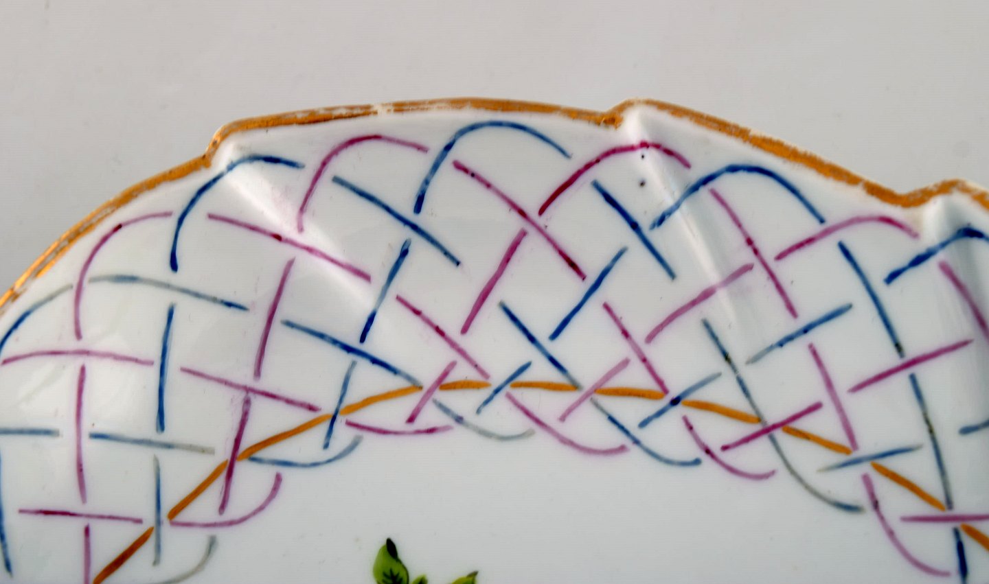 Antik håndmalet Meissen asiet med fuglemotiv og pousserende blomster. Midt 1800-tallet. Måler: 25 x 21 cm. I god stand med minimale skår på blomsterne. Stemplet. 2. Sortering.