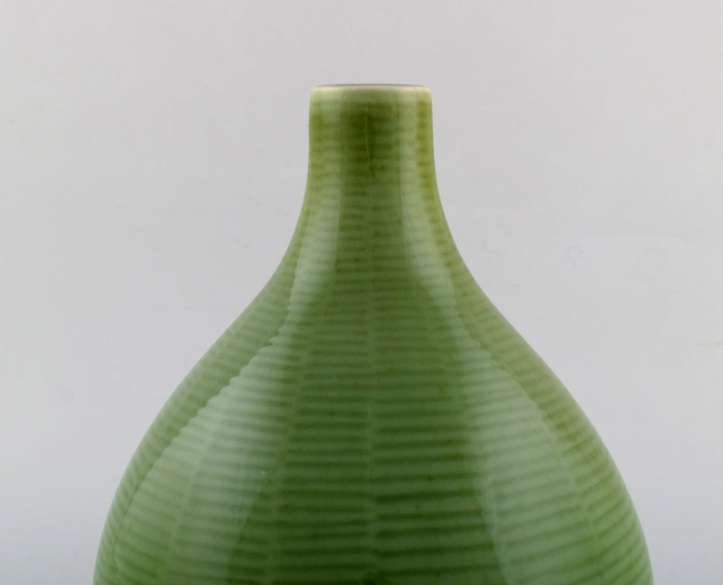 Axel Salto for Royal Copenhagen. Løgformet vase af stentøj med smal munding og horisontale riller, dekoreret med celadonglasur. 1940'erne. Signeret salto. Måler: 26,5 x 20 cm. I perfekt stand. 1. Sortering.