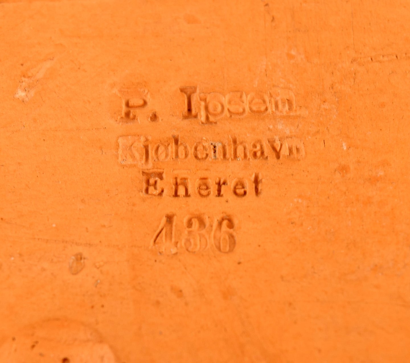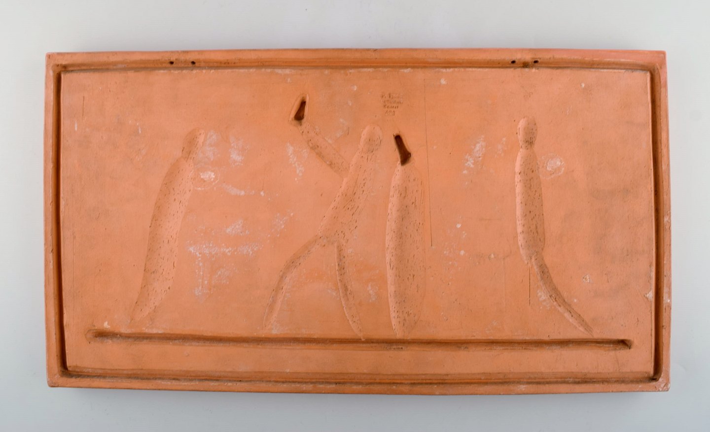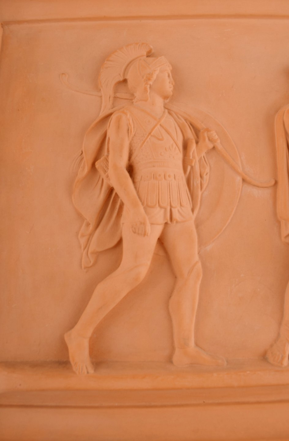 Ipsens enke, Danmark. Stor vægplakette i terracotta med motiv efter Thorvaldsen. 1890'erne. Måler: 49,5 x 27 cm. I flot stand. Stemplet.