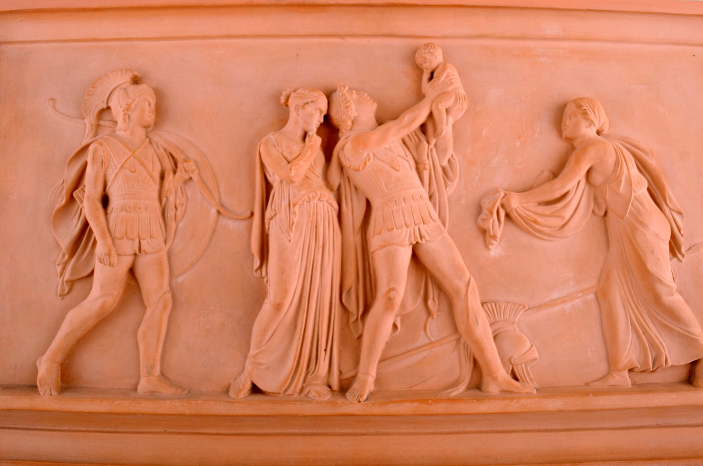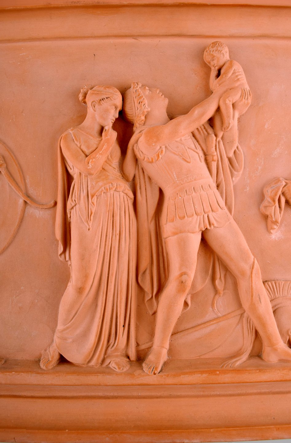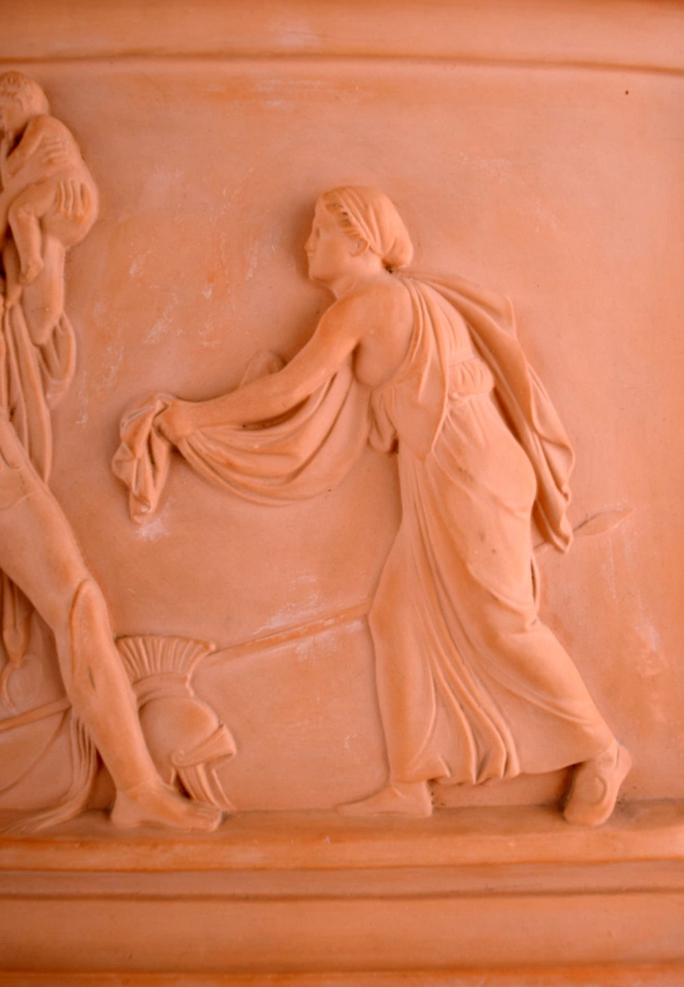 Ipsens enke, Danmark. Stor vægplakette i terracotta med motiv efter Thorvaldsen. 1890'erne. Måler: 49,5 x 27 cm. I flot stand. Stemplet.