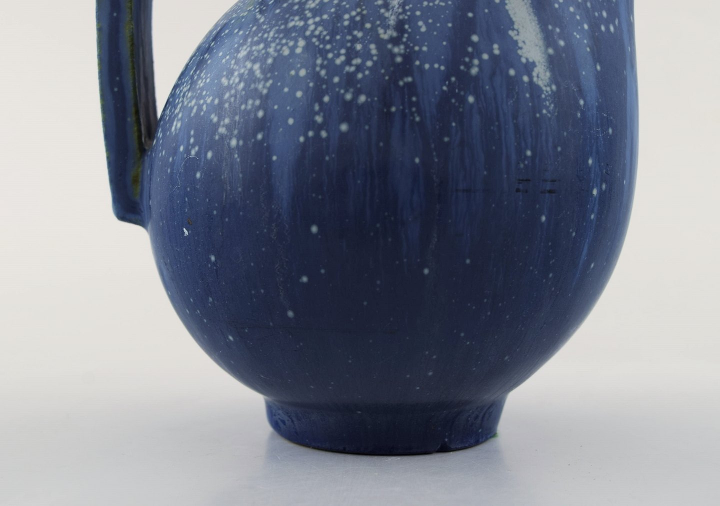 Arne Bang. Kande med hank i glaseret keramik. Modelnummer 161. Smuk glasur i blå nuancer. 1940/50'erne. I flot stand. Signeret. Måler: 15 x 15 cm.