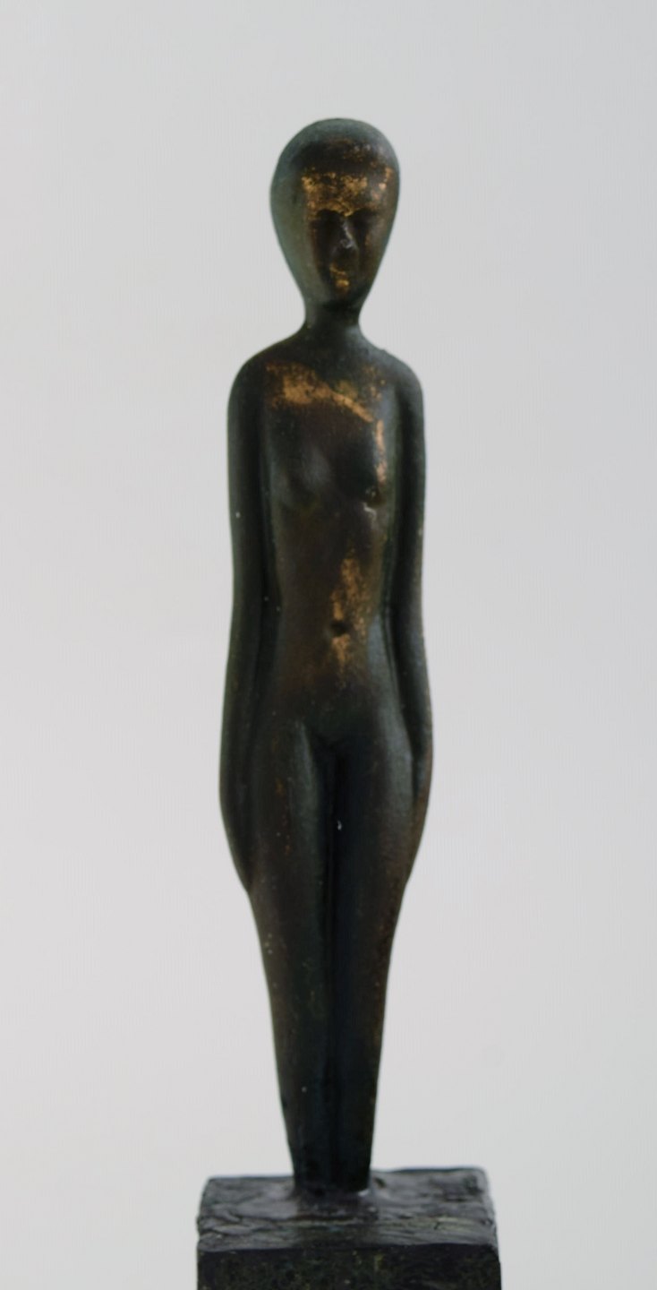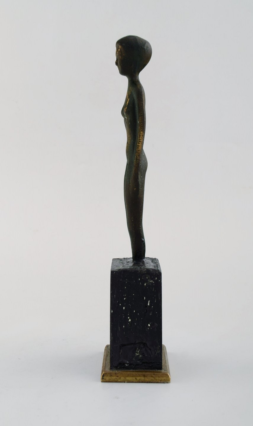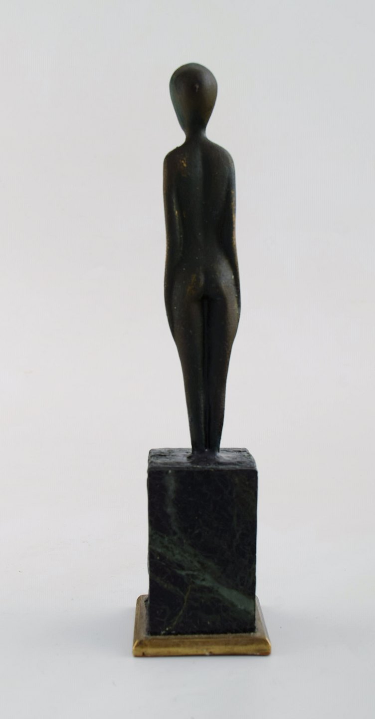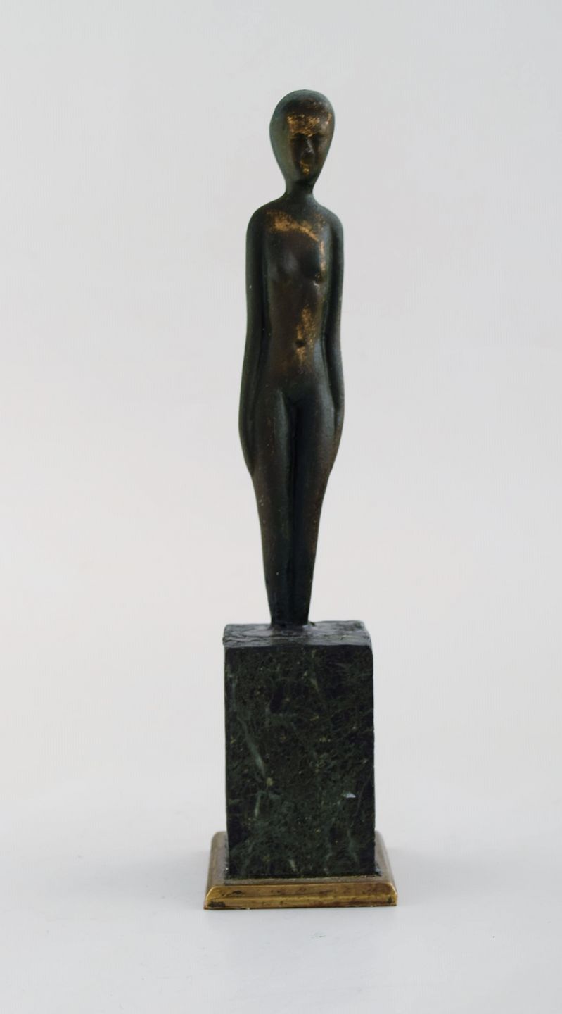 Bronzeskulptur på marmor piedestal. Nøgen kvinde i minimalistisk stil. Midt 1900-tallet. Måler: 22 x 5,5 cm. I flot stand.