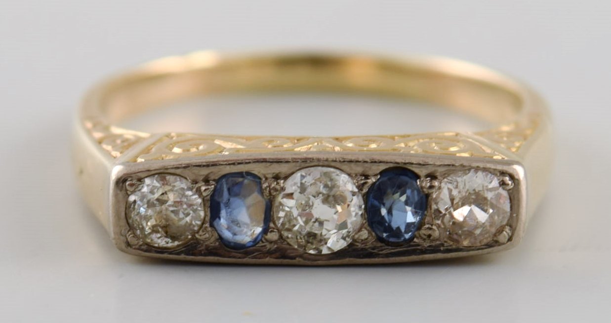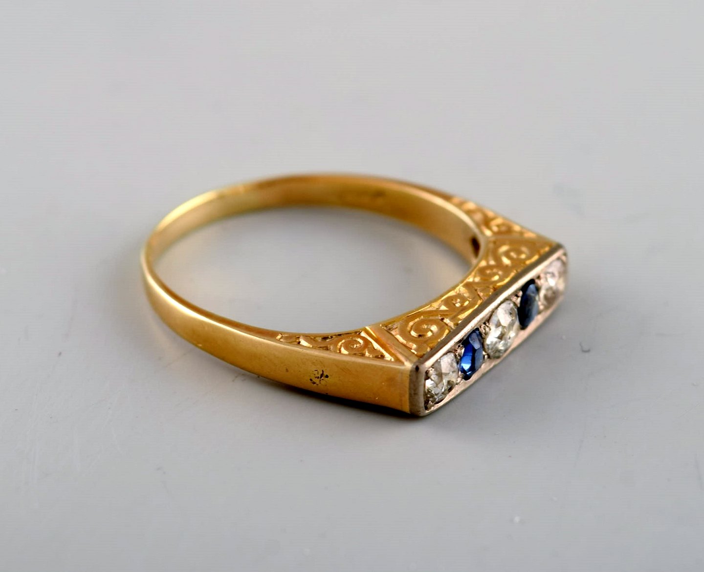 Scandinavian jeweler. 14 carat art deco gold ring adorned with brilliants and sapphires. Mid 20th century. Diameter: 18.4 mm. US size: 8.25. In very good condition. Stamped.