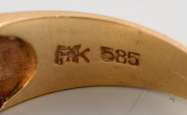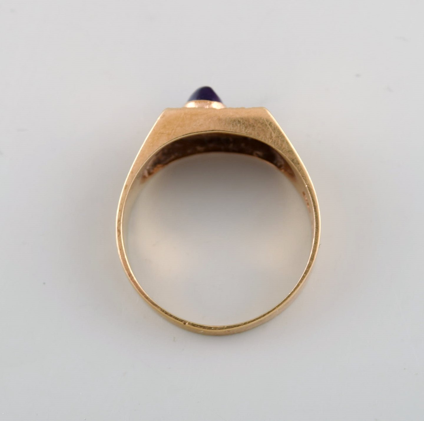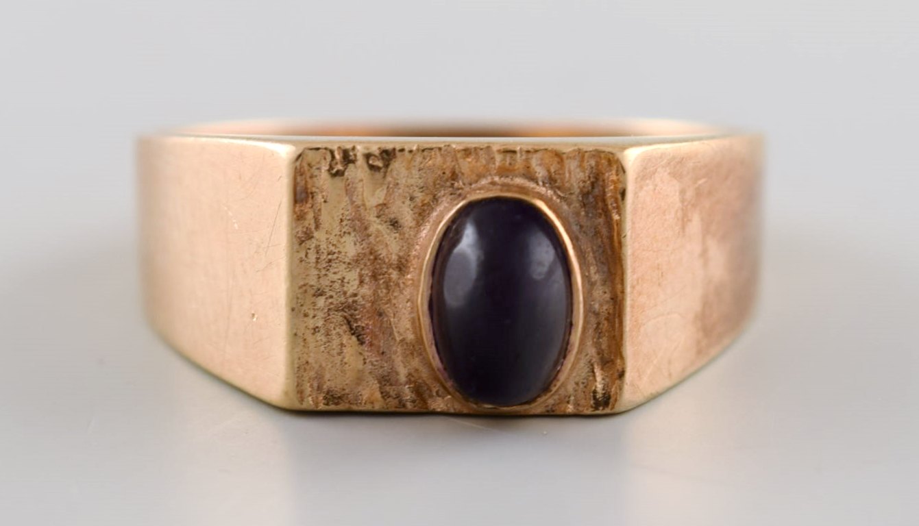 Skandinavisk guldsmed. 14 karat modernistisk guldring prydet med mørk ametyst. Midt 1900-tallet. Diameter: 18 mm. US size: 7.75. I flot stand. Stemplet.
