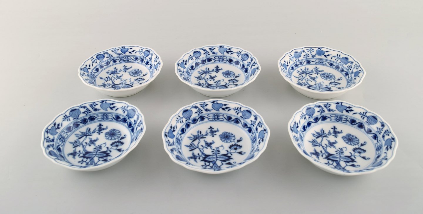 Seks antikke Meissen "Løgmønstret" skåle i håndmalet porcelæn. Tidligt 1900-tallet. Måler: 12 x 3 cm. Stemplet. I flot stand. Tre med små brændingfejl. 2. Sortering.