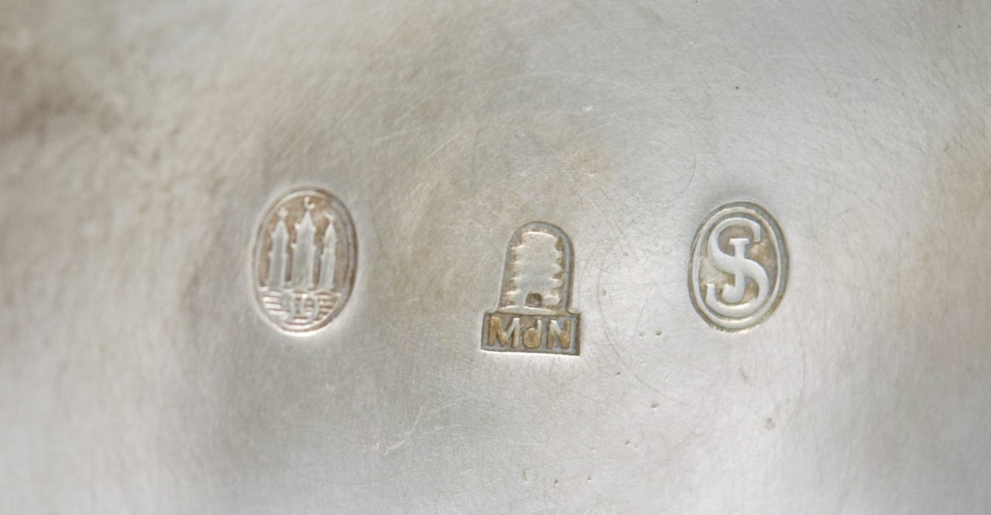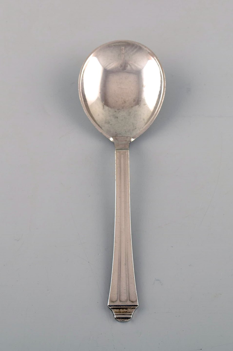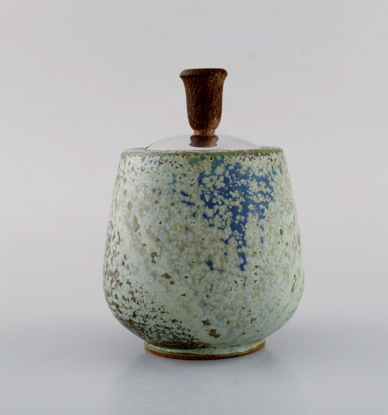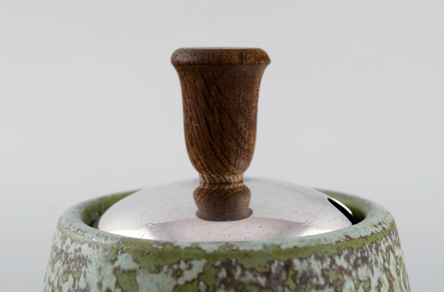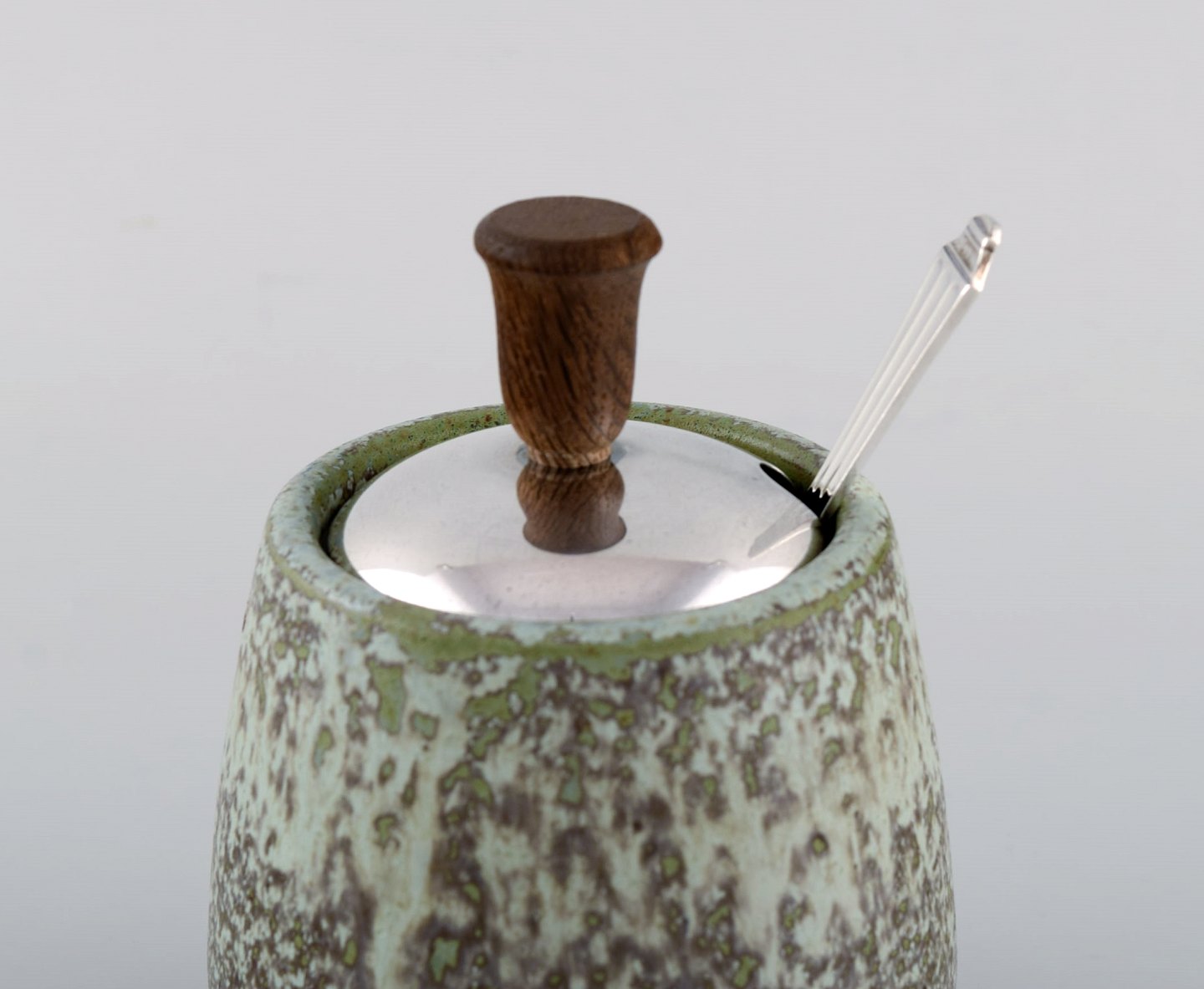 Arne Bang, Denmark. Ceramic marmelade jar with matching silver lid and silver spoon by Hans Hansen. Dated 1939.