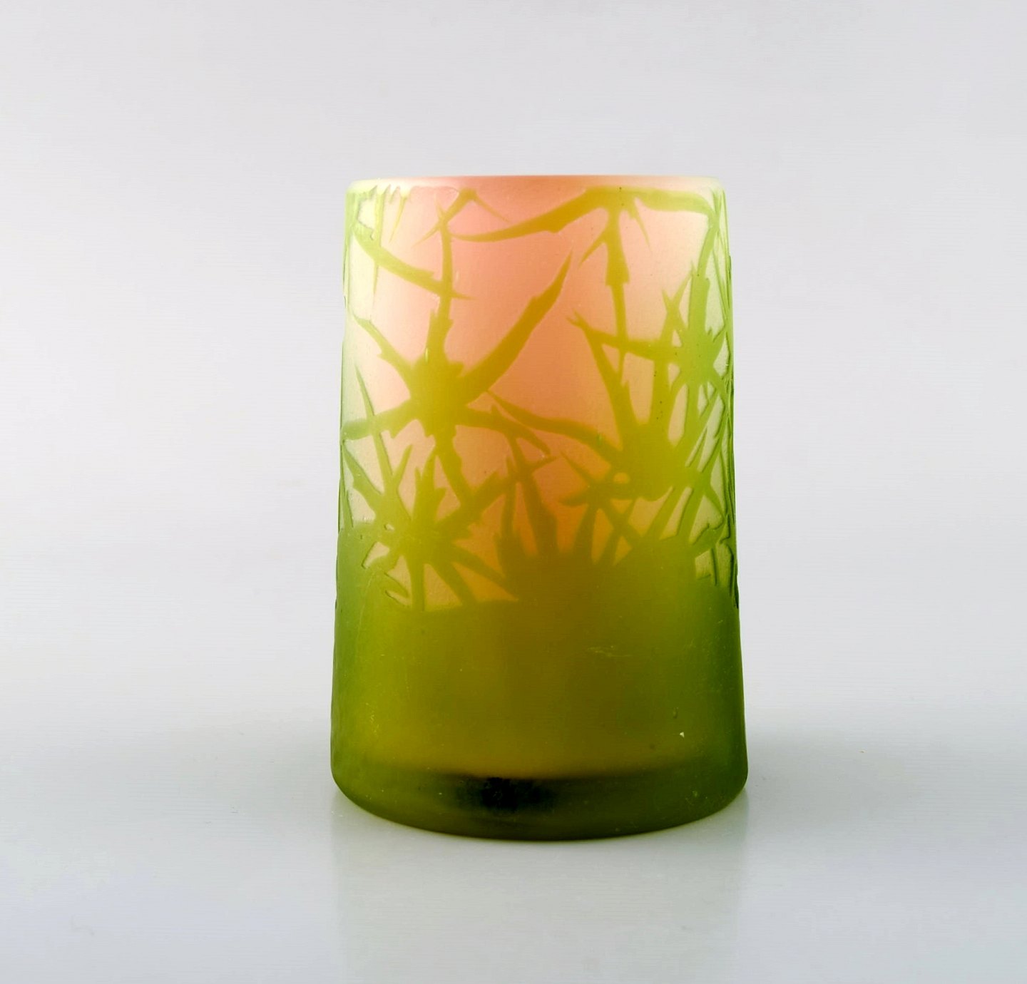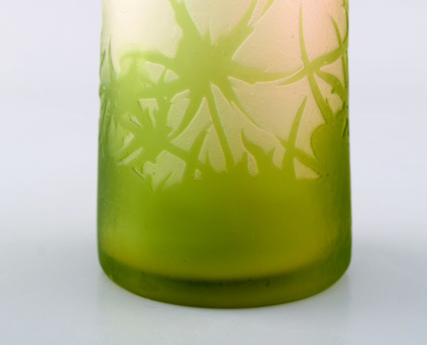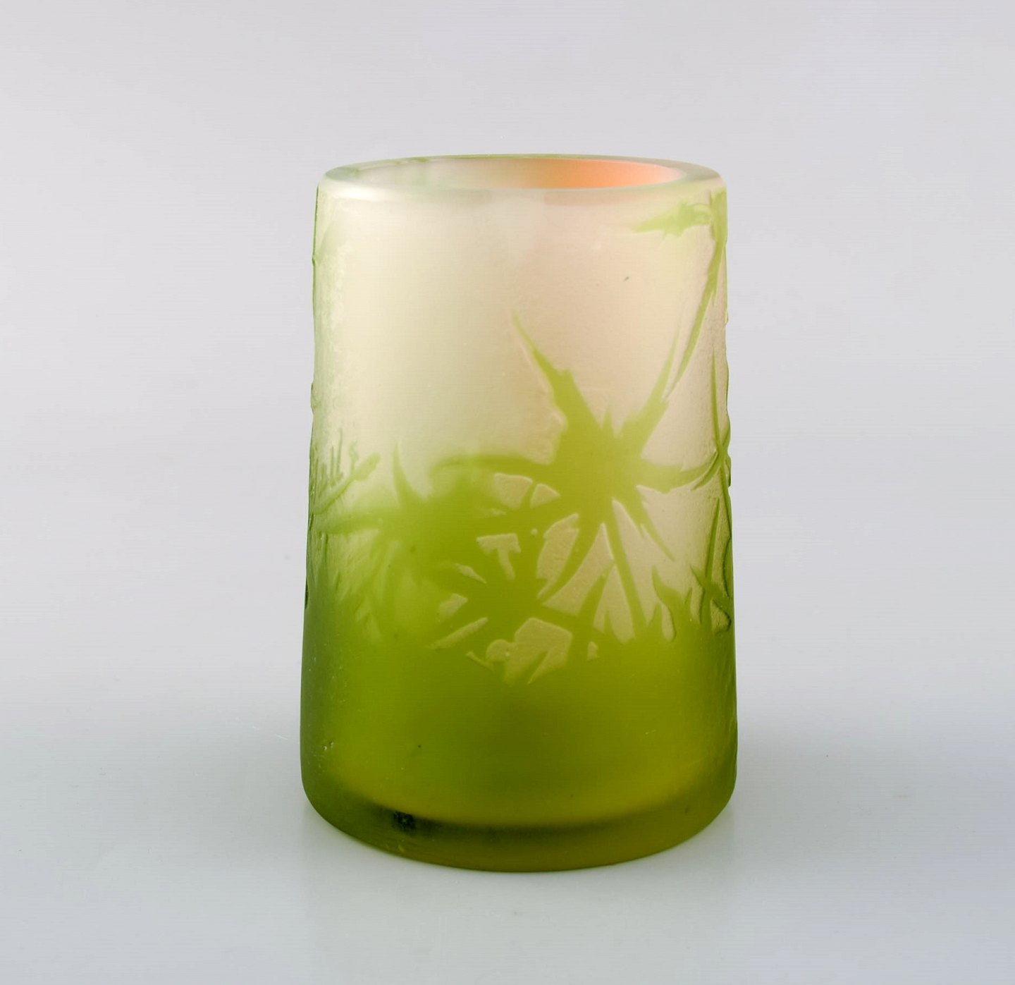 Emile Gallé vase in frosted and green mouth-blown art glass carved with motifs in the form of foliage. 1920 / 30's. Measures: 10.5 x 7.5 cm. Signed. In very good condition.