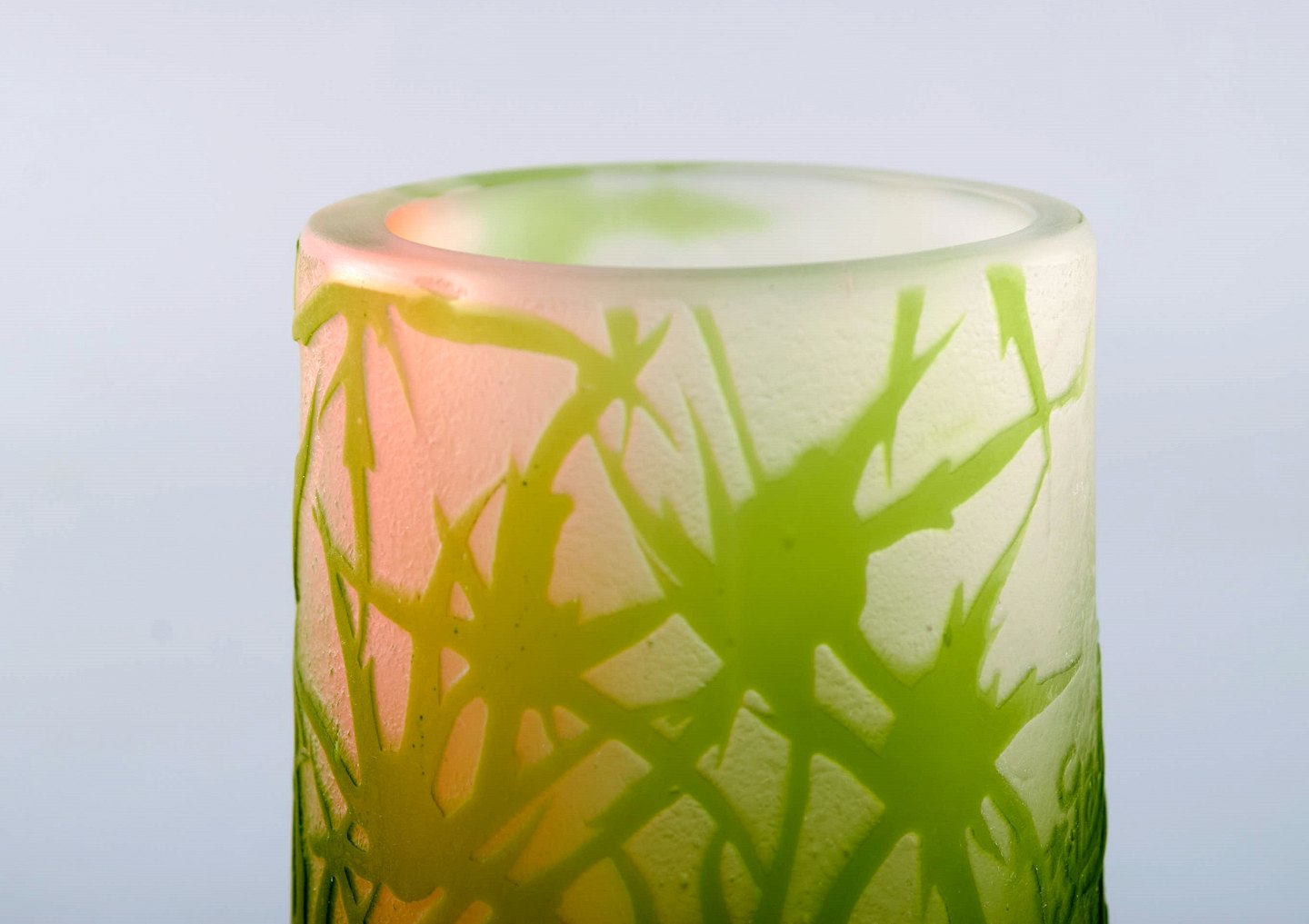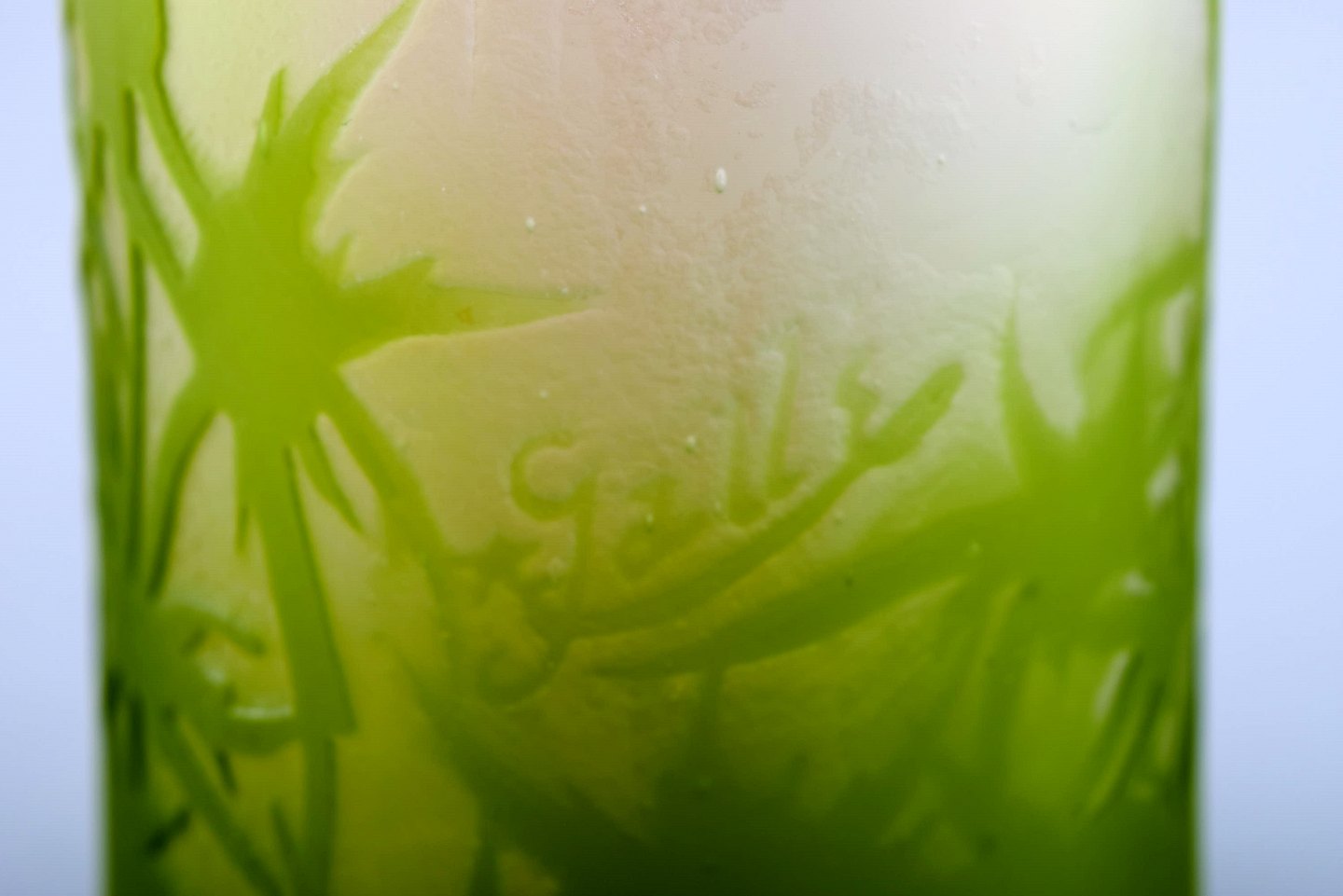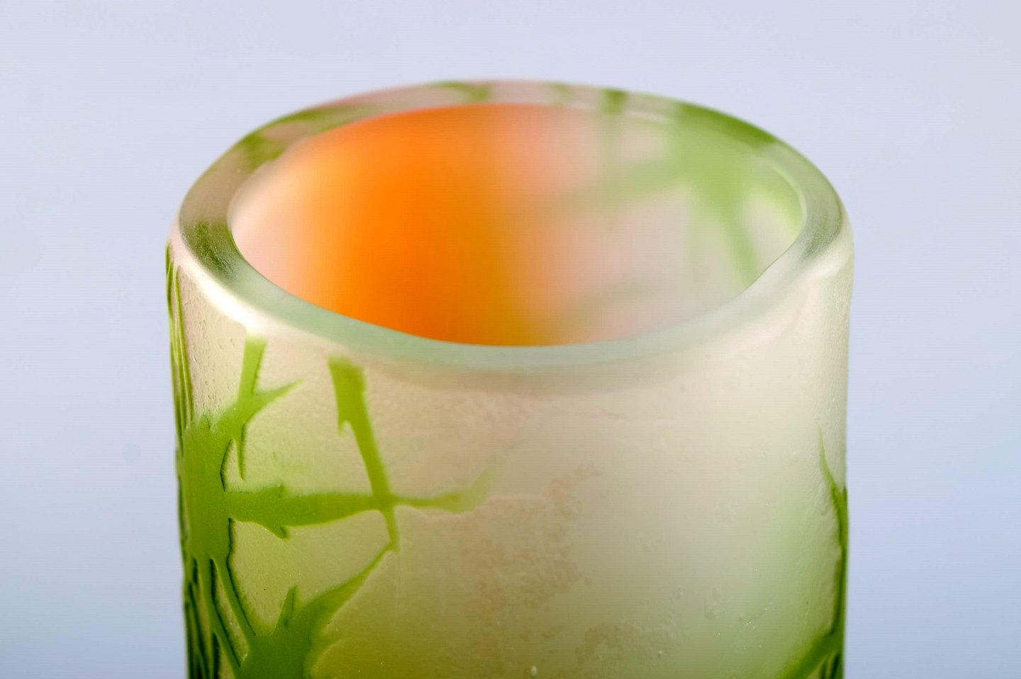 Emile Gallé vase in frosted and green mouth-blown art glass carved with motifs in the form of foliage. 1920 / 30's. Measures: 10.5 x 7.5 cm. Signed. In very good condition.