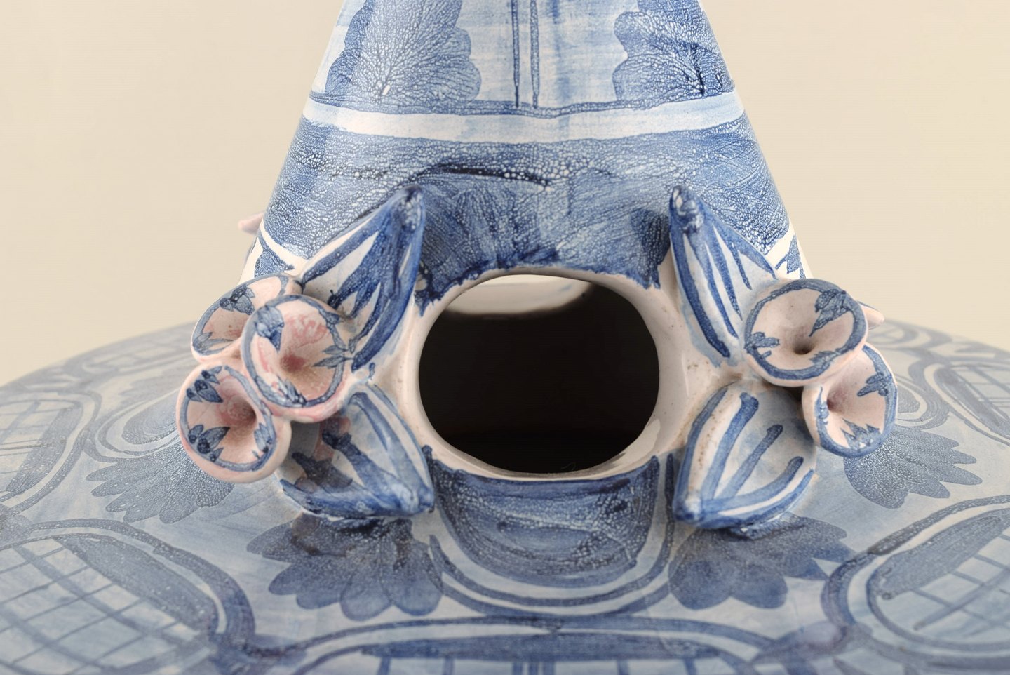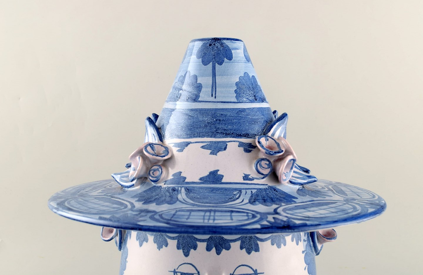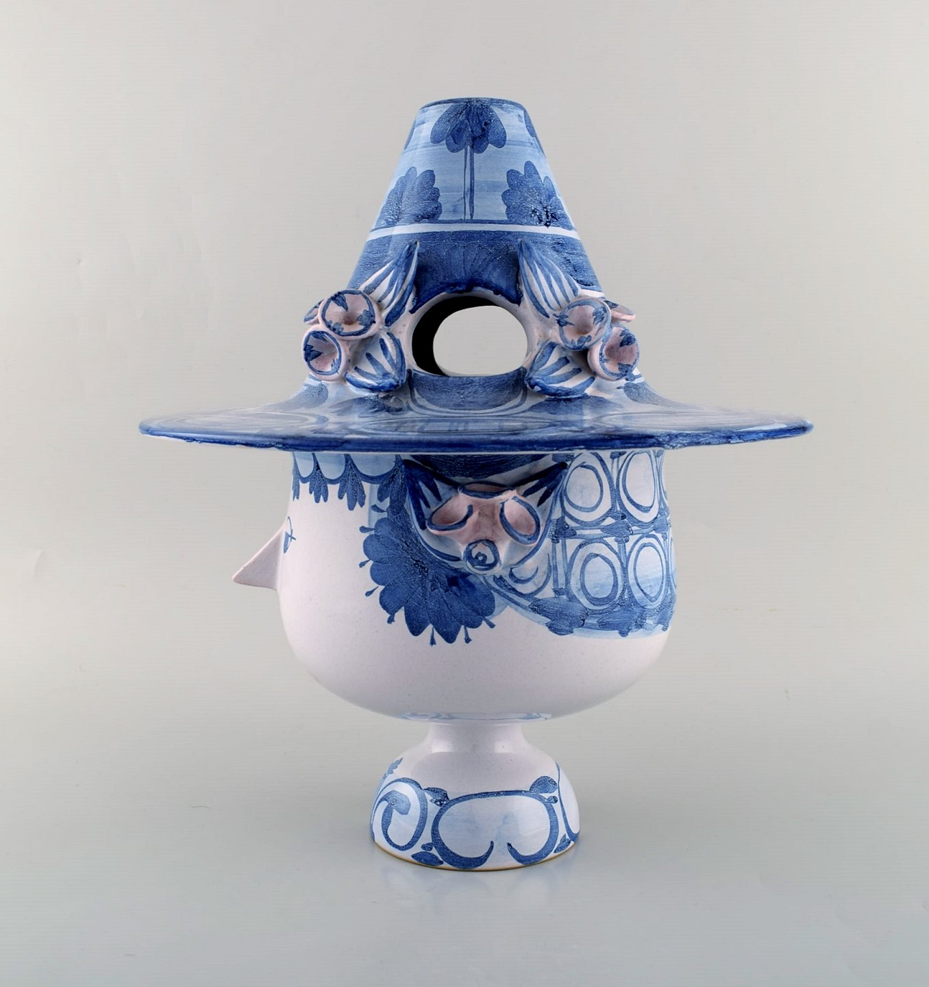 Stor Bjørn Wiinblad, det blå hus. Figur-opsats med lågformet spidshat af Bjørn Wiinblad. Stemplet i bunden med år 1981 samt figur nr. V 52. Måler 37 x 31 cm. I perfekt stand.