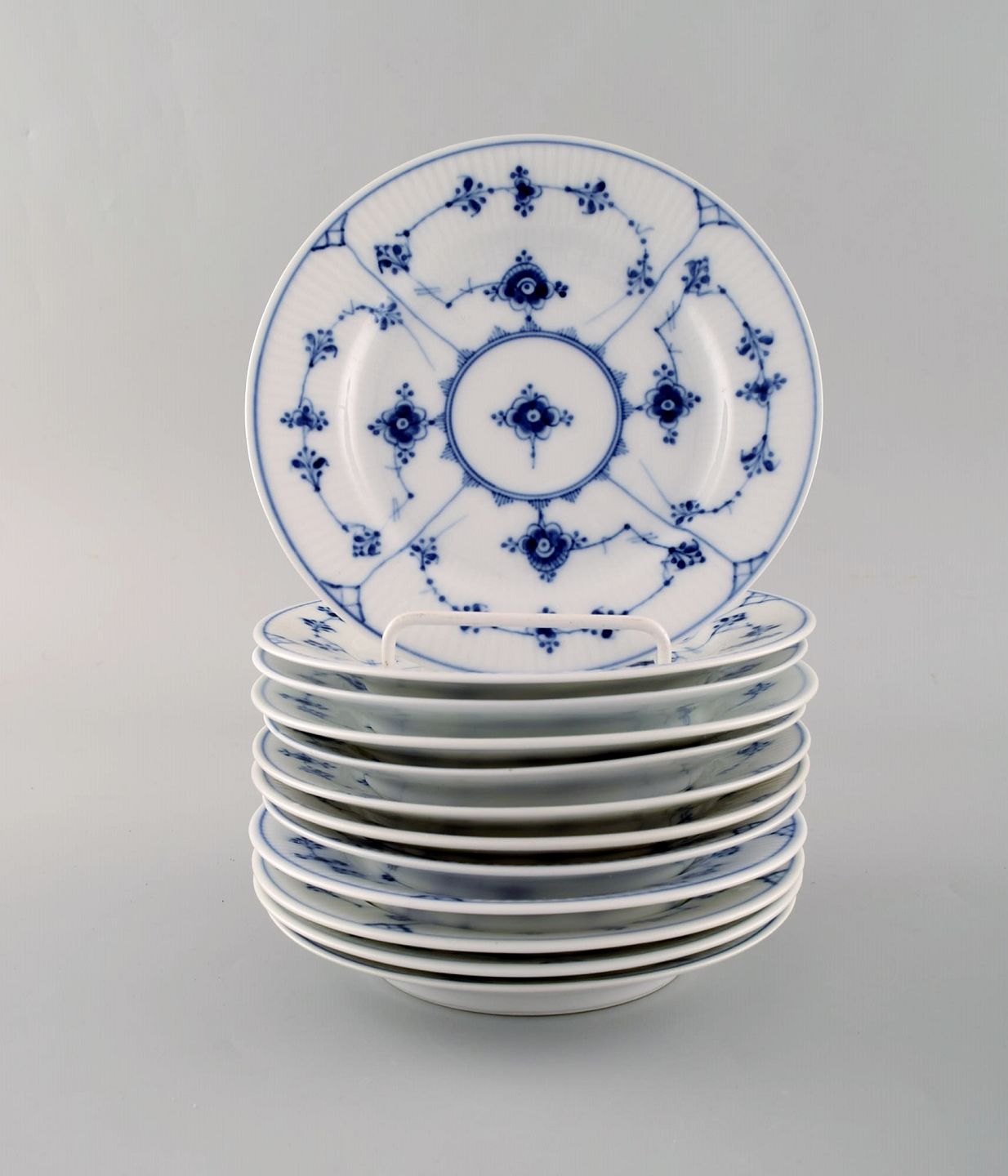 Royal Copenhagen. Sæt på 12 musselmalet riflet tallerken # 1/181. I perfekt stand. 1. sortering. Stemplet. Diameter: 15,5 cm.