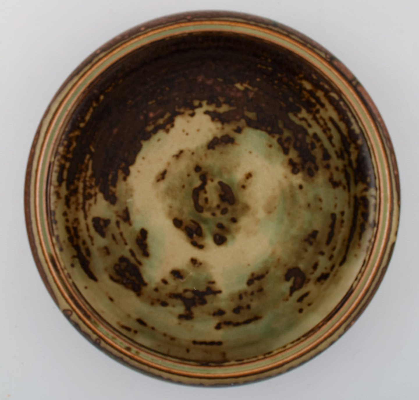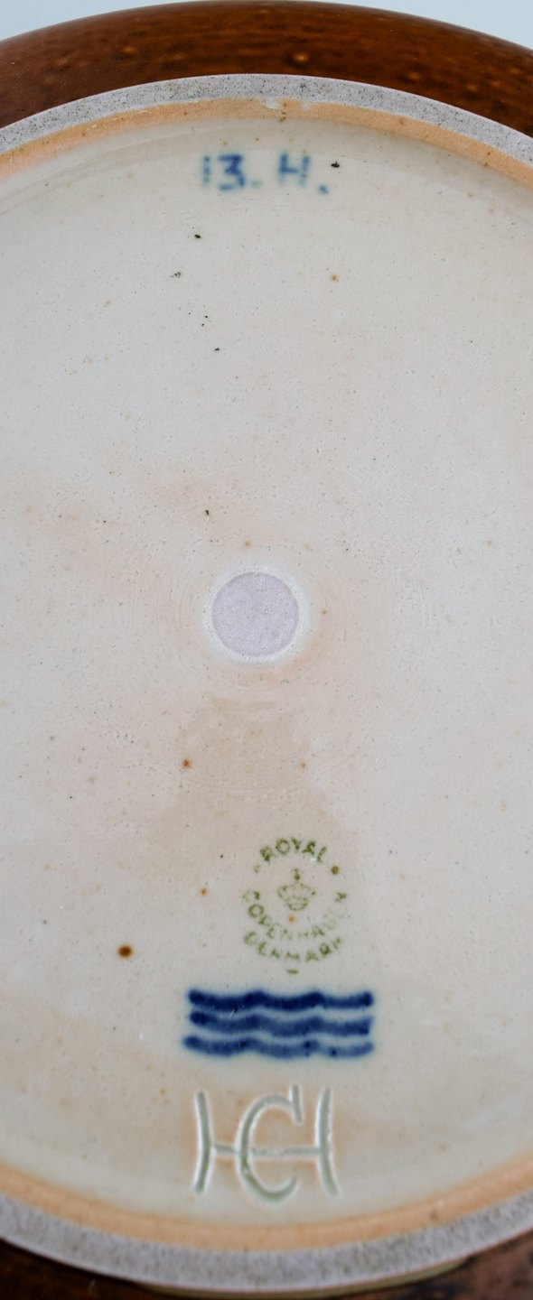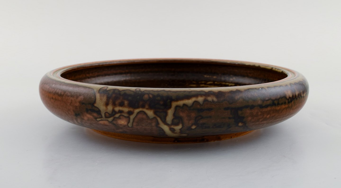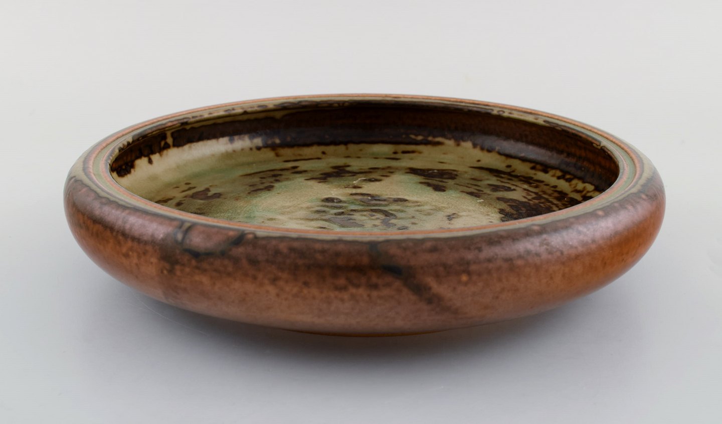 Carl Halier for Royal Copenhagen. Rundt fad i glaseret keramik. Smuk sungglasur. Midt 1900-tallet. Måler: 25 x 5 cm. I flot stand. Stemplet.