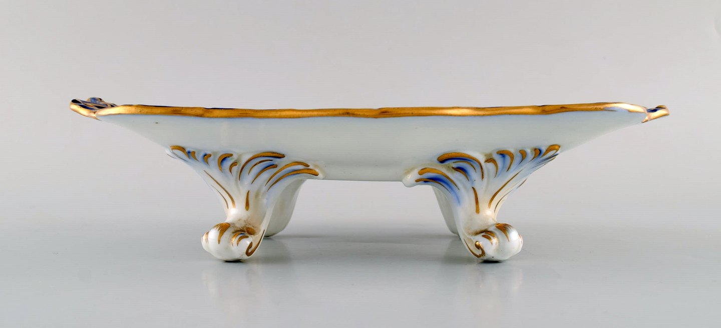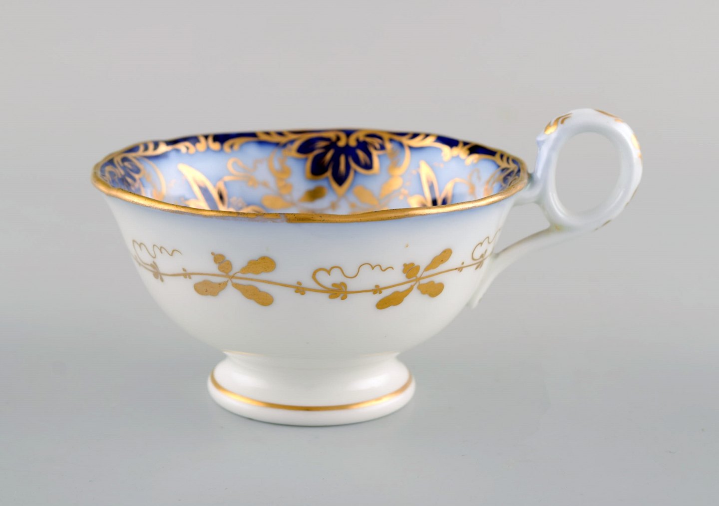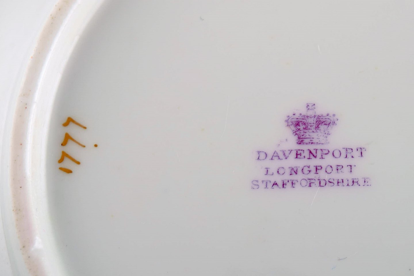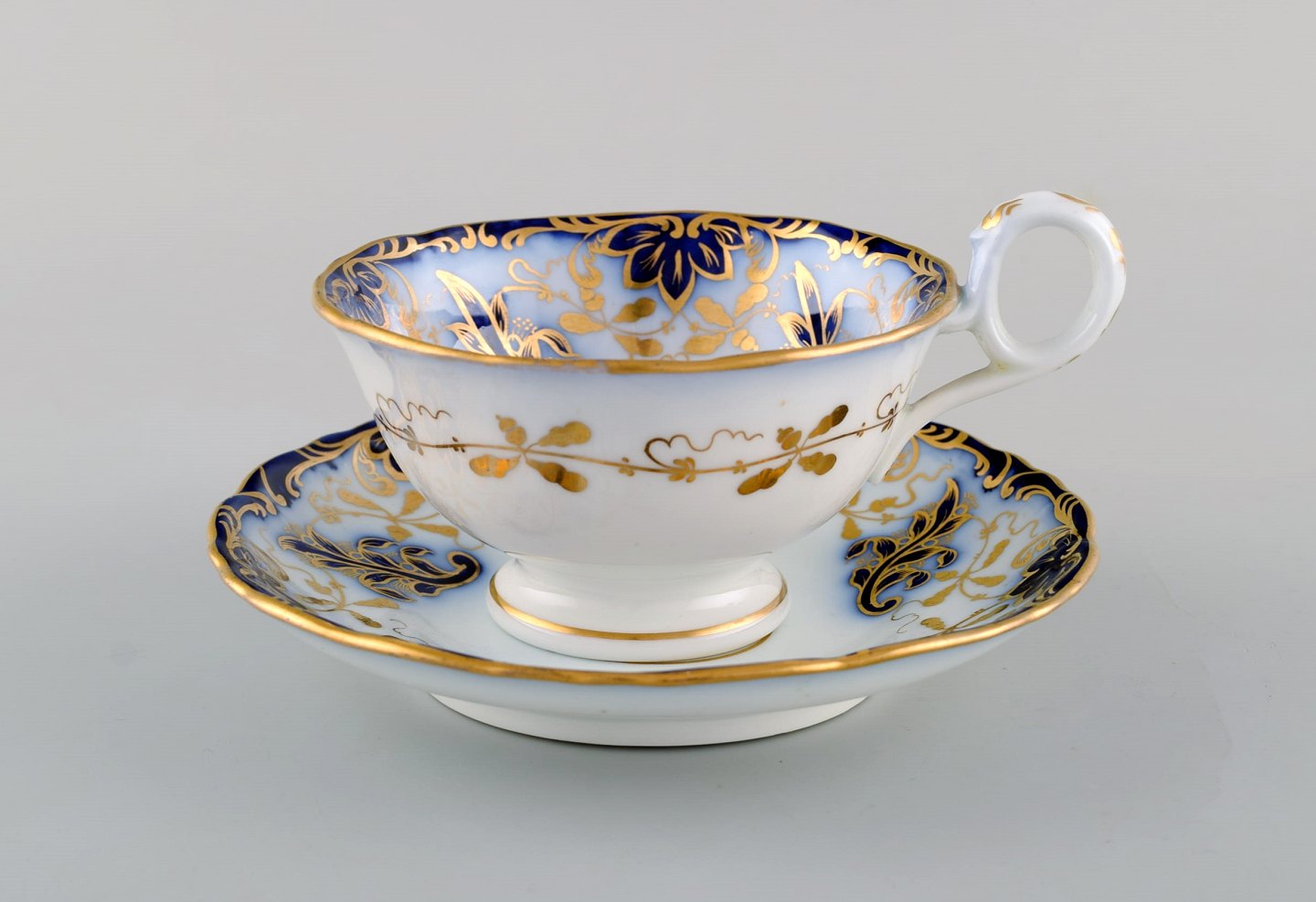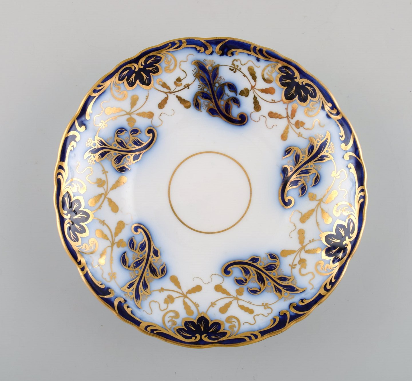 Davenport, Longport Staffordshire. Antikt teservice til otte personer i håndmalet porcelæn med lav opsats. Lilla blomster og gulddekoration. Tidligt 1900-tallet.