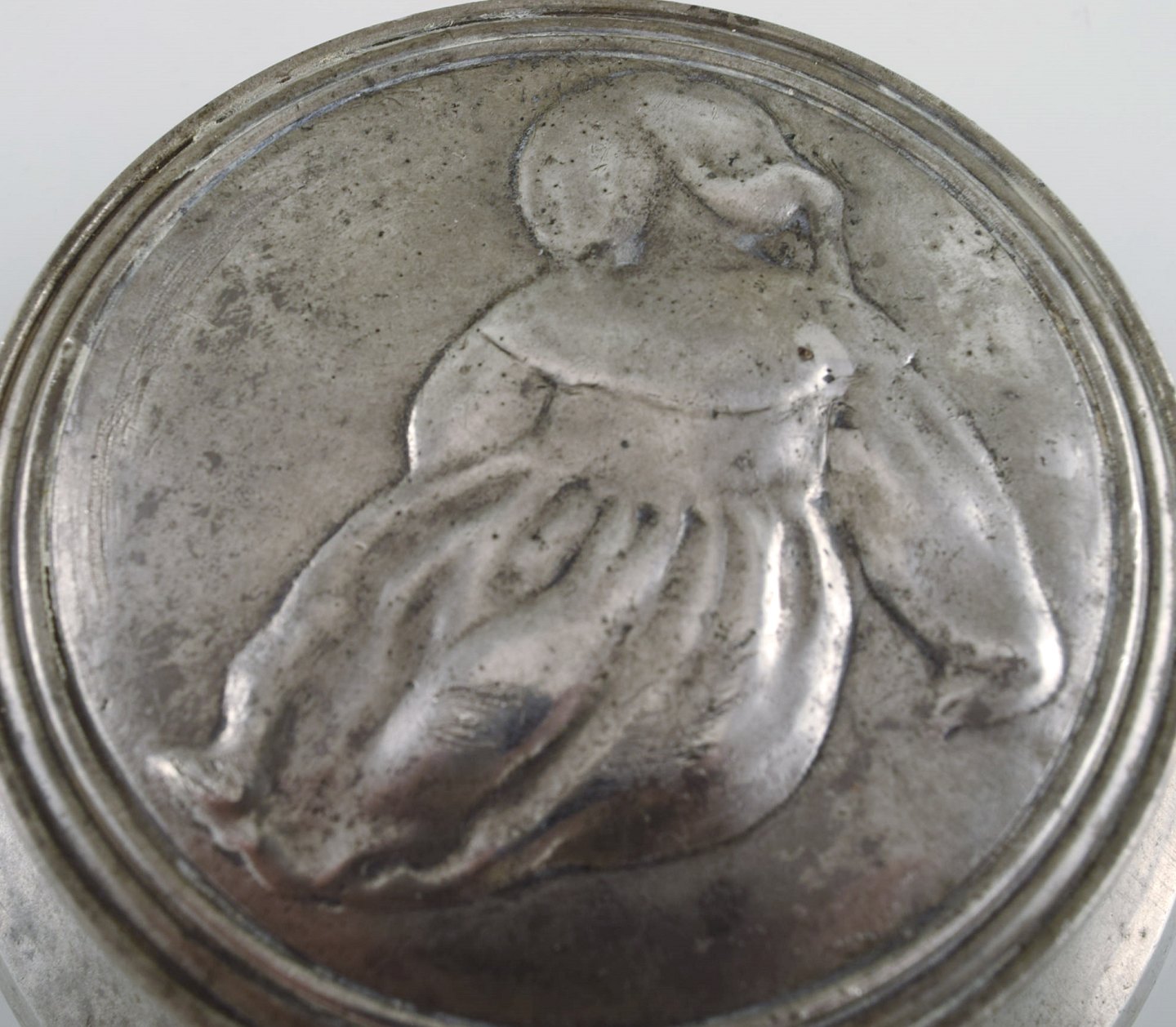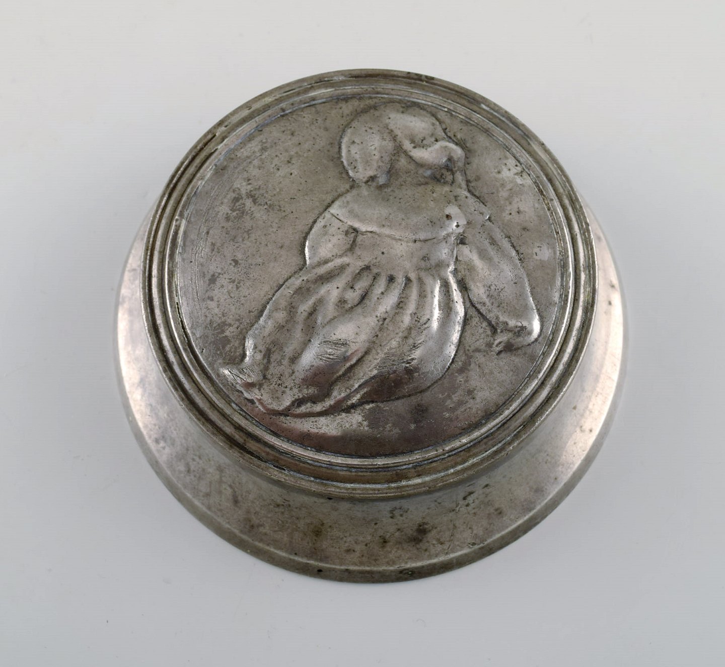 Ballin/Hertz, Danmark. Skønvirke lågæske i tin dekoreret med ung pige. Ca. 1920. Måler: 13 x 4,5 cm I flot stand. Stemplet.