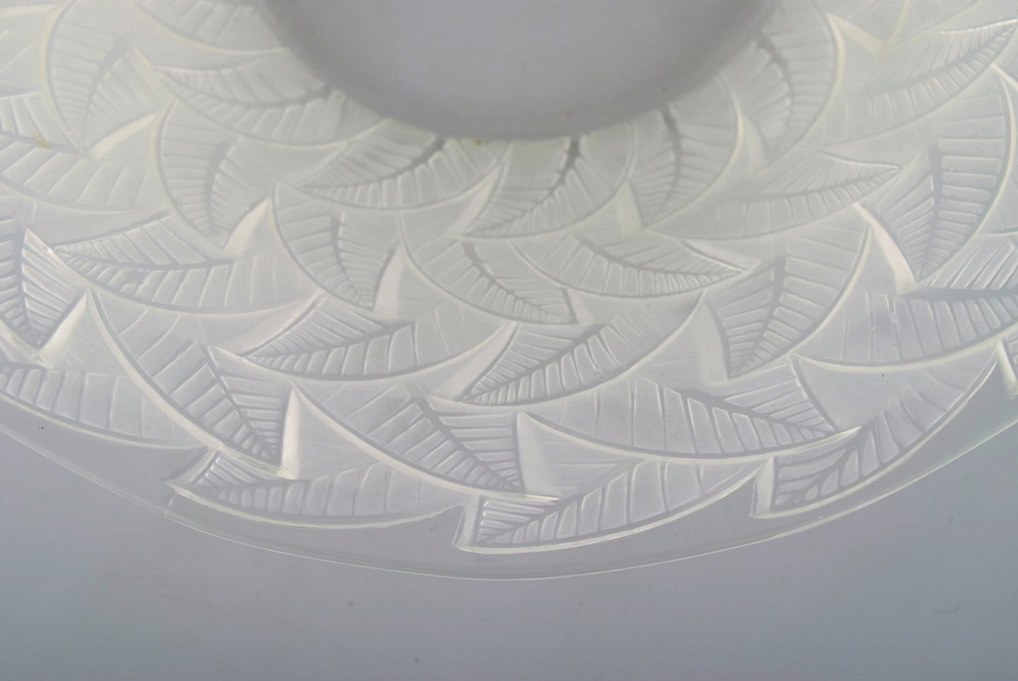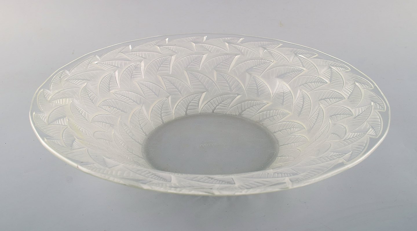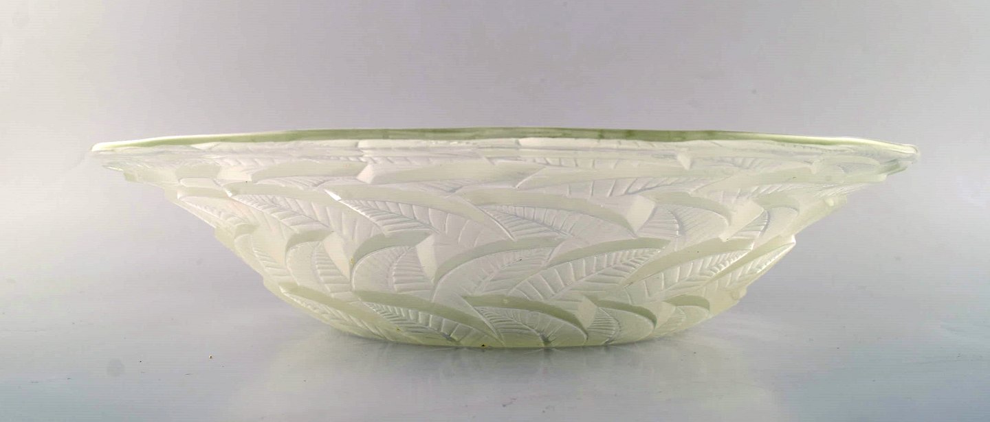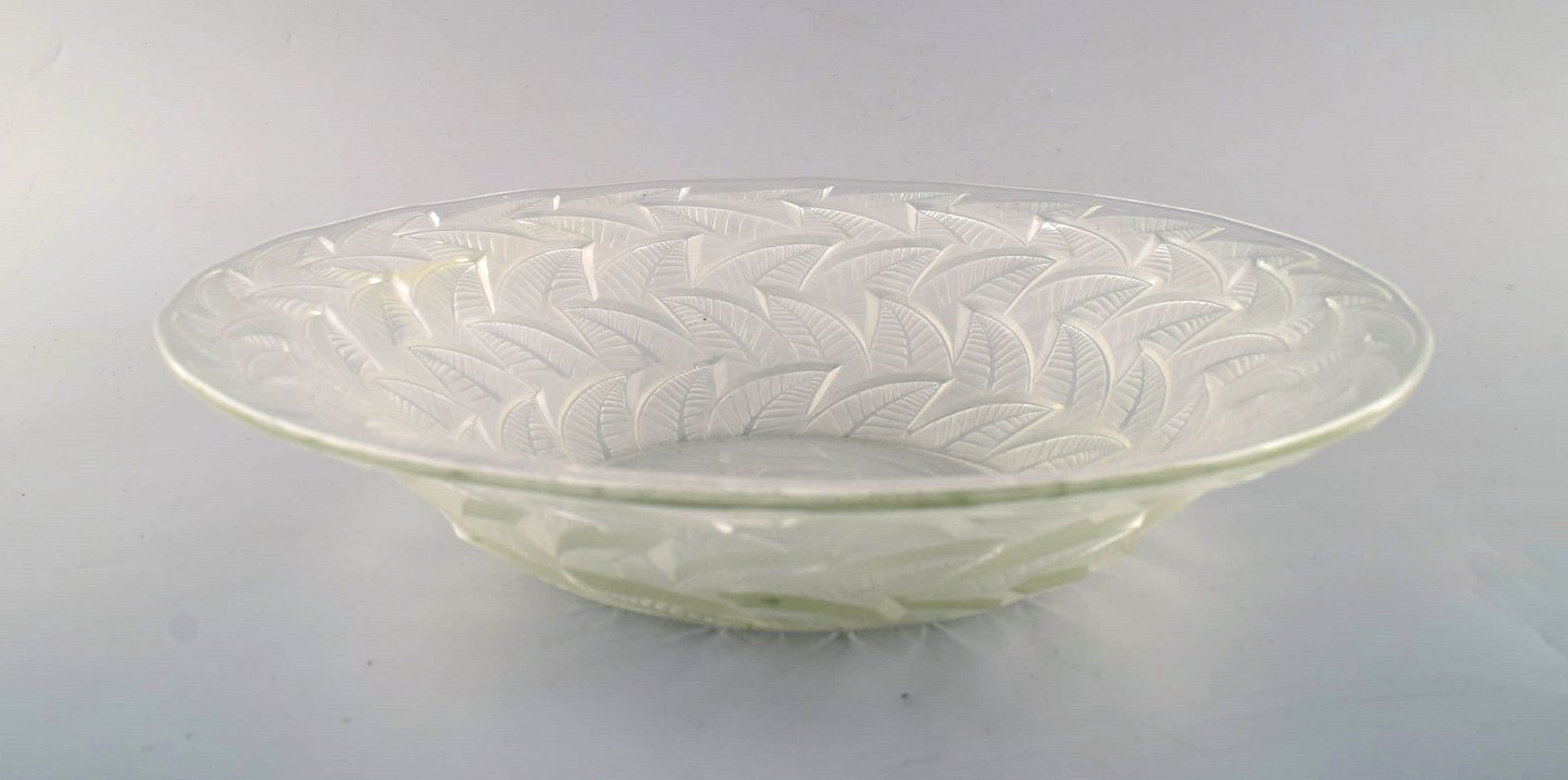 Tidlig René Lalique. Stor "Ormeaux" skål i kunstglas med bladværk. Modelnummer 3049. Dateret før 1945. Designet 1931. Stemplet: R. Lalique. I flot stand. Måler: 31 x 7 cm.