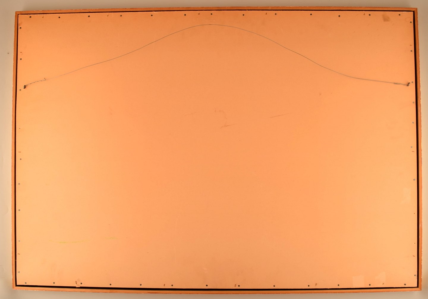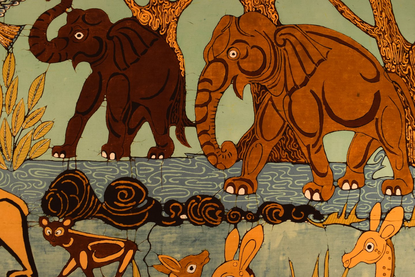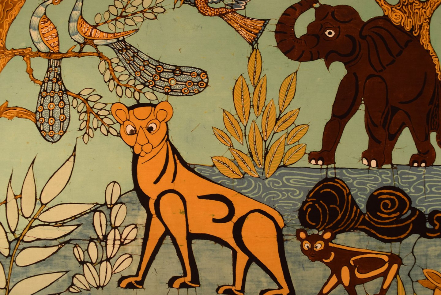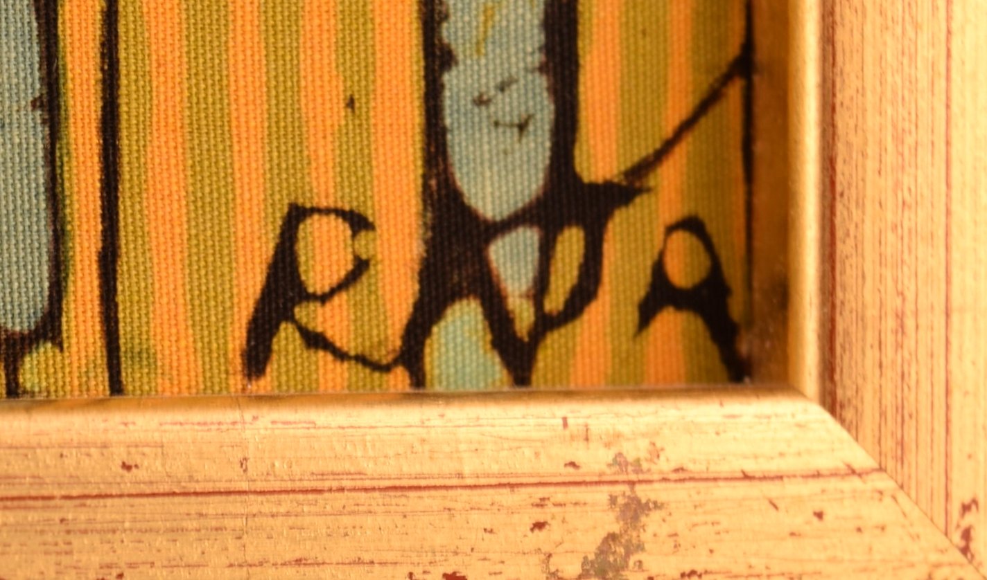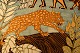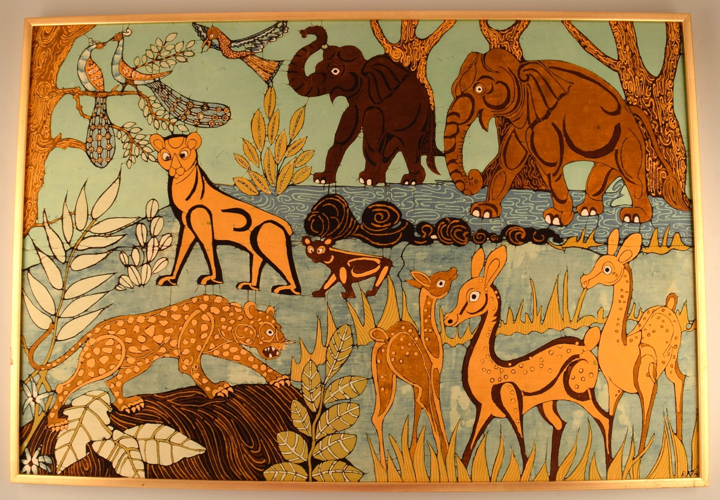 Ukendt kunstner. Tekstilkunst. Stof sat på plade. Naivistisk junglemotiv. Midt 1900-tallet. Pladen måler: 95 x 64 cm. Rammen måler: 1,5 cm. Signeret: Rada. I flot stand.