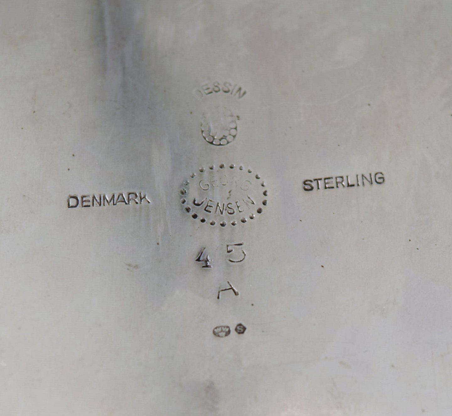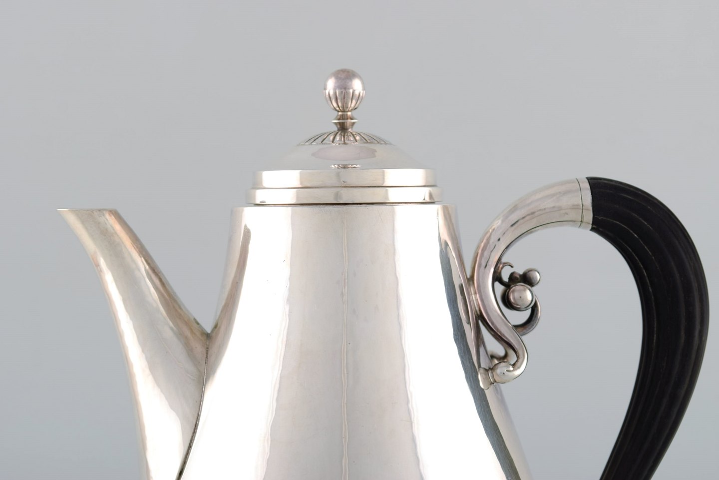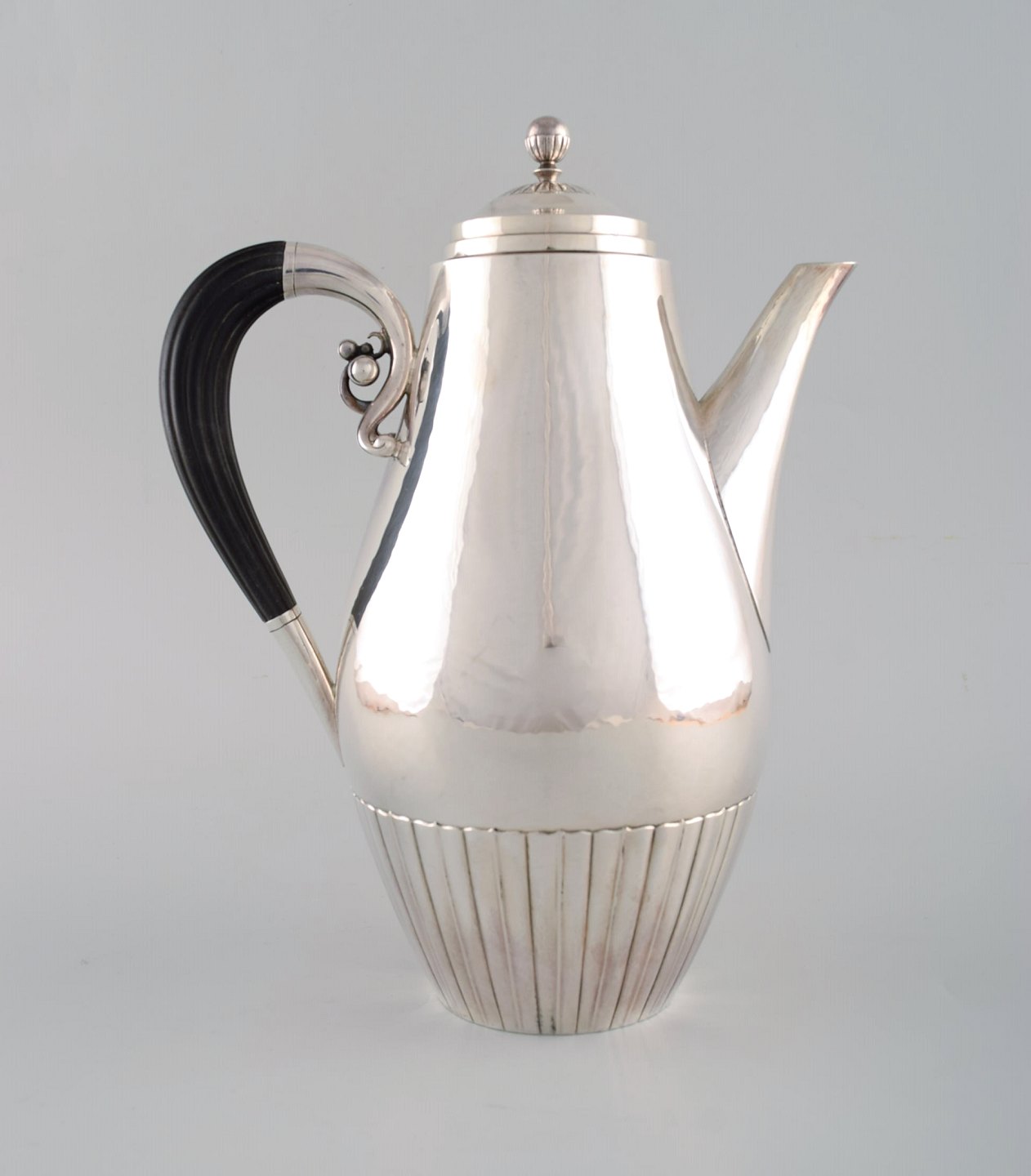 Johan Rohde for Georg Jensen. Kosmos kaffekande i sterlingsølv med hank i ibenholt. Dessin 45A.