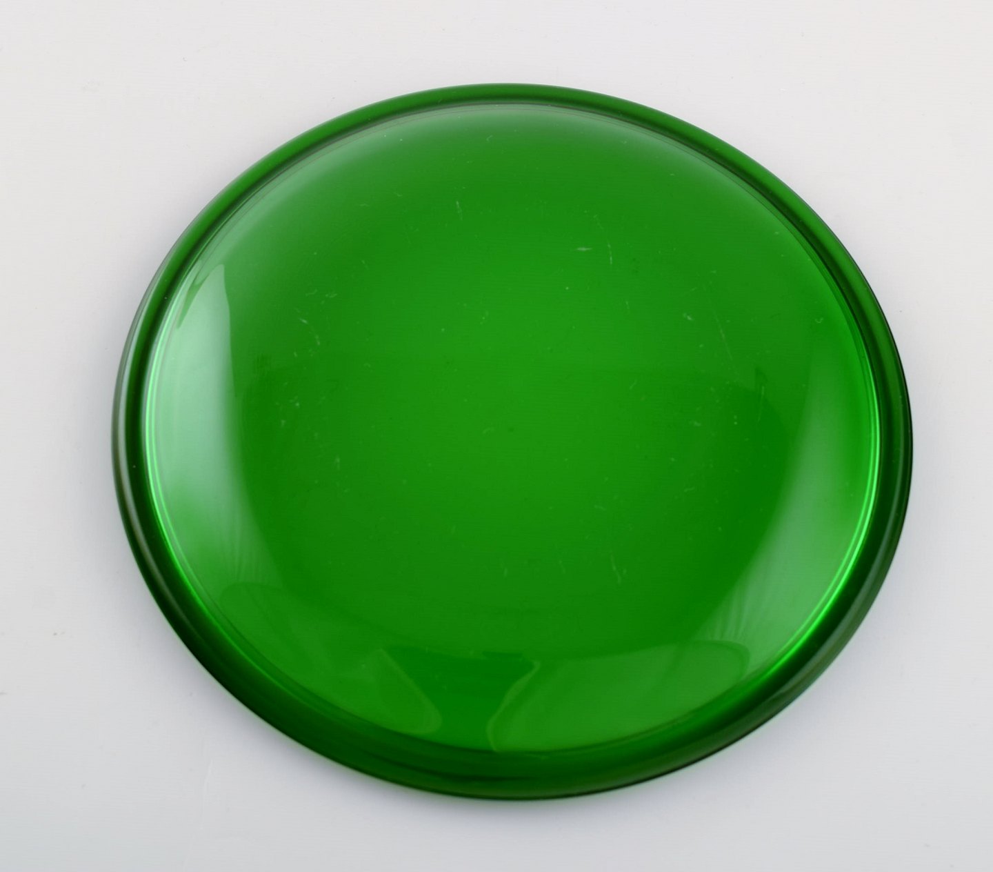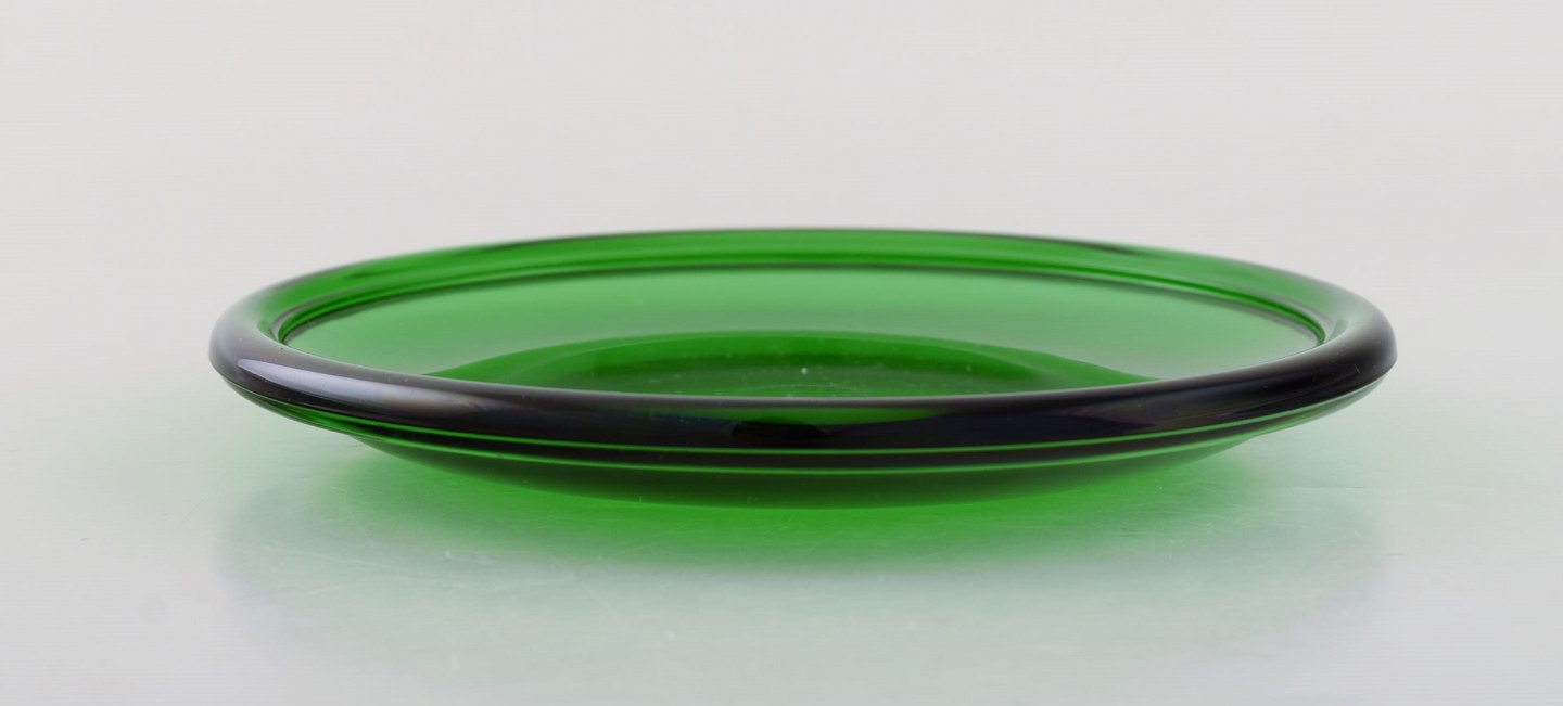 Kaj Franck for Nuutajärvi. Seks Luna tallerkener i grønt kunstglas. 1970'erne. Diameter: 15 cm. I flot stand.