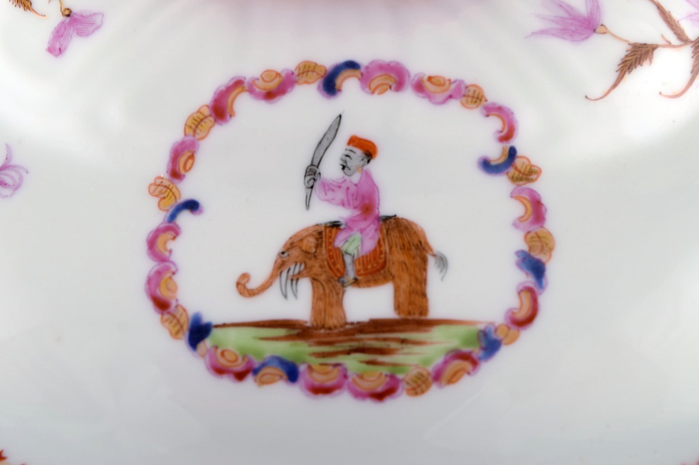 Samson, Frankrig. Stor antik lågterrin i håndmalet porcelæn. Lyserøde blomster og krigere på elefanter. Kinesisk stil, sent 1800-tallet.
