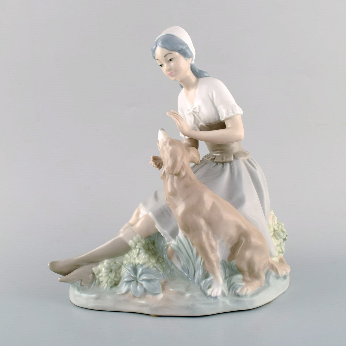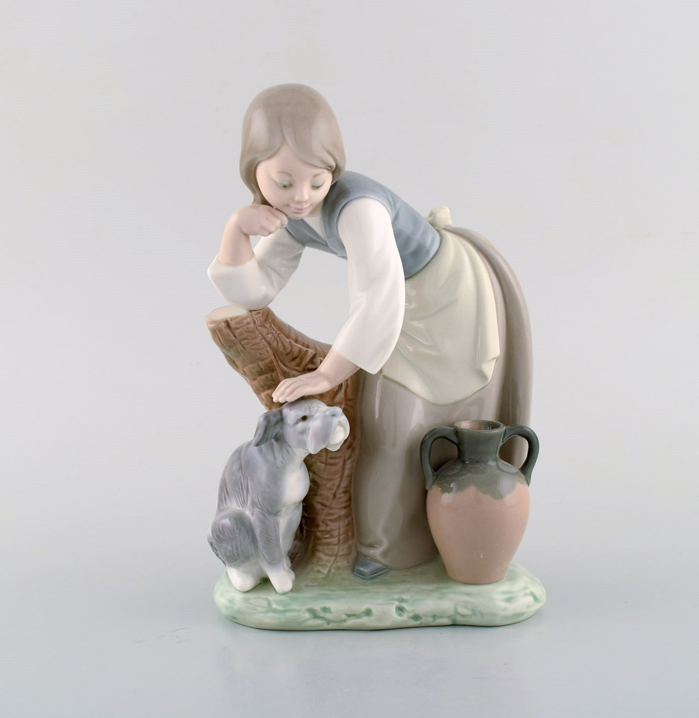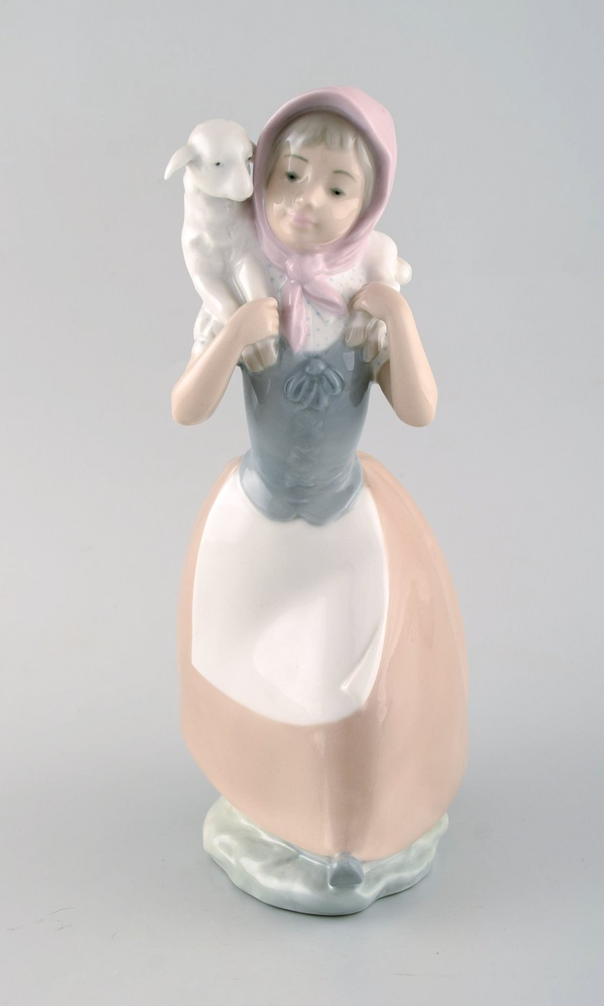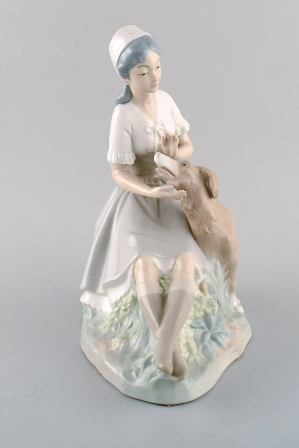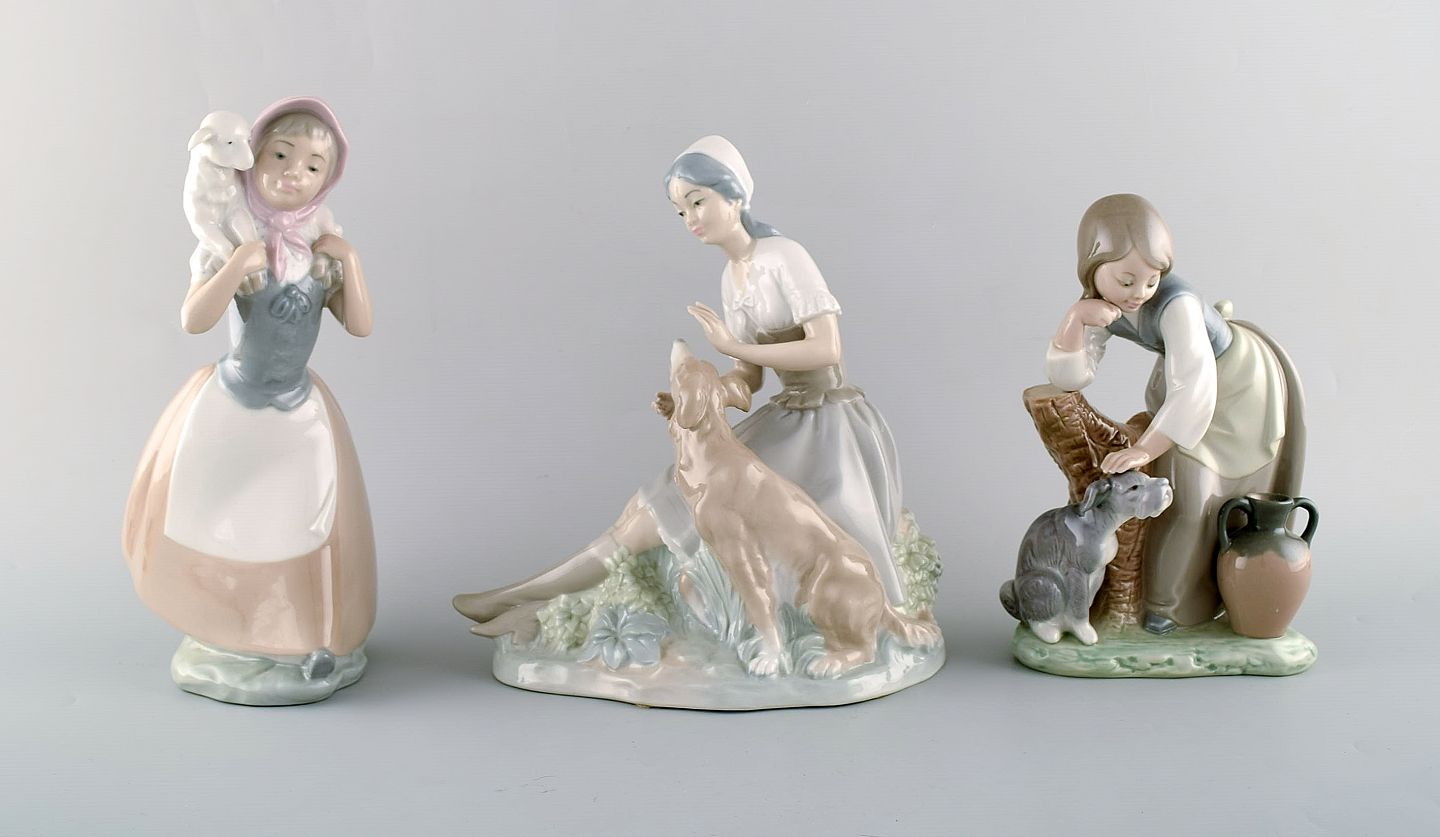 Lladro og Nao, Spanien. Tre porcelænsfigurer. Unge piger. 1980'erne. Største måler: 23,5 x 22 cm. I flot stand. Stemplet.