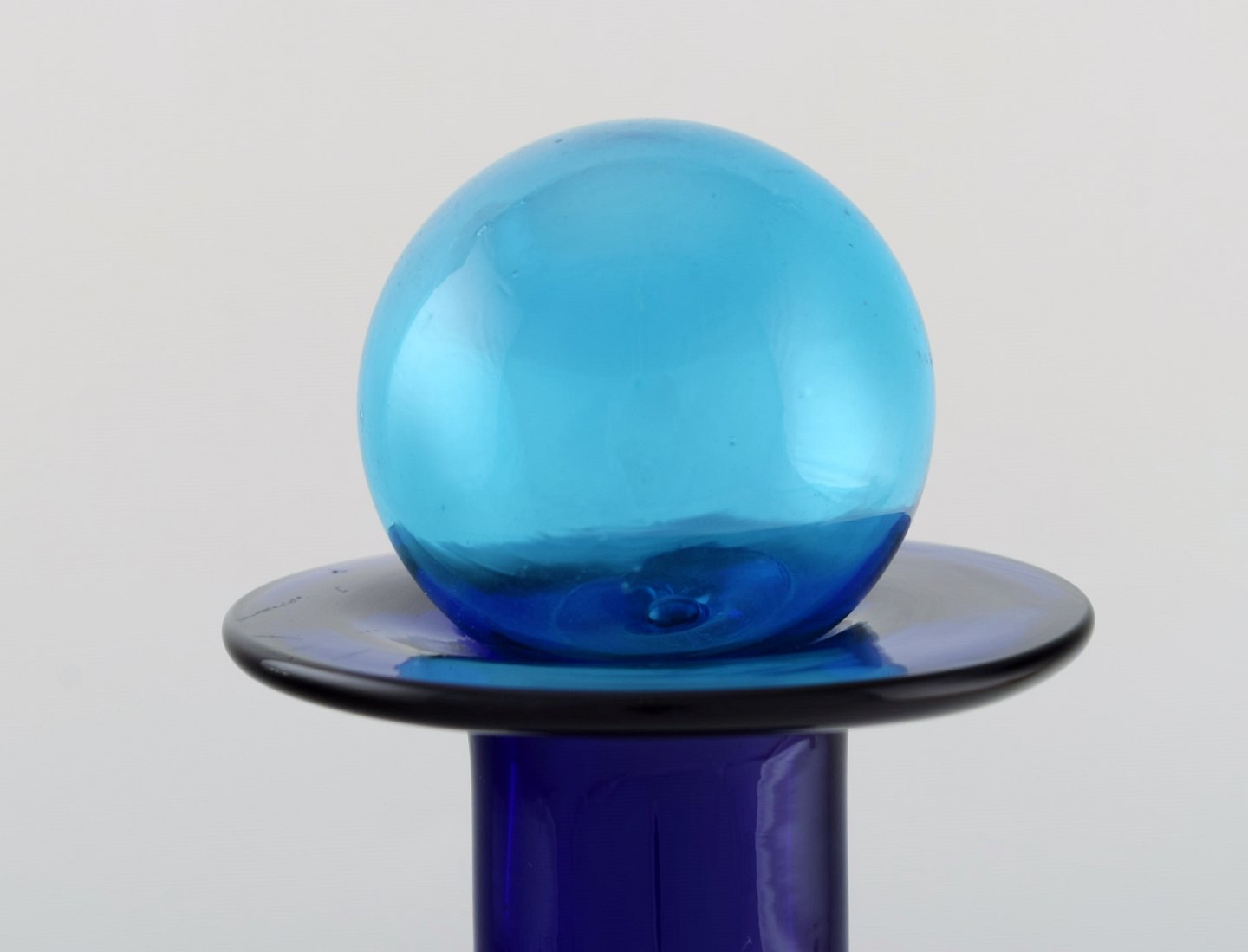 Otto Brauer for Holmegaard. Stor vase/flaske i blåt kunstglas med blå kugle. 1960'erne. Måler: 29,5 x 9,5 cm (inkl kugle). I perfekt stand.