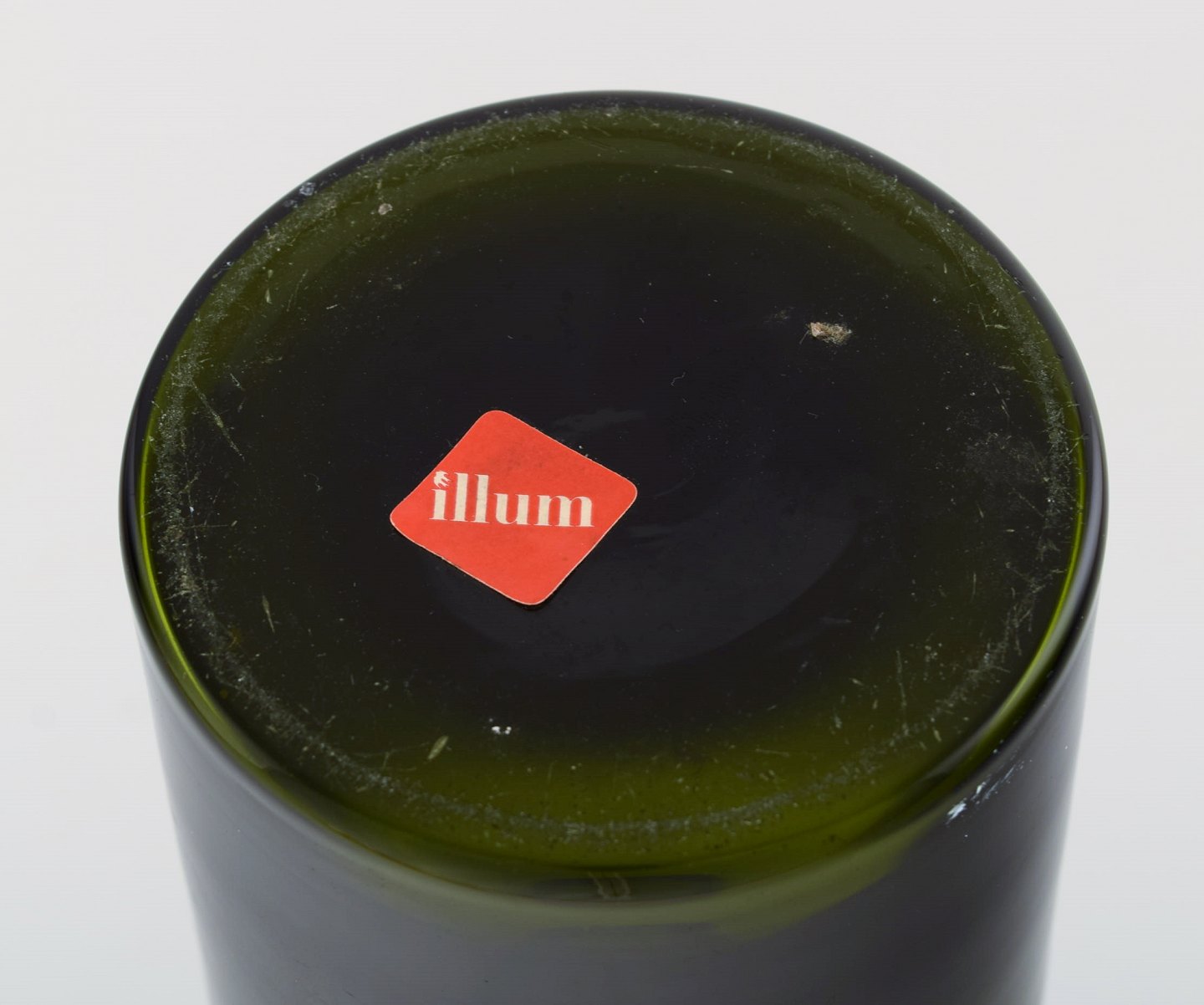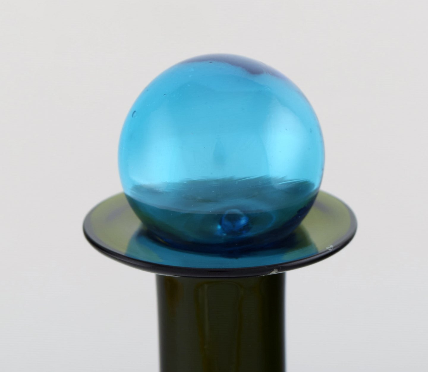 Otto Brauer for Holmegaard. Stor vase/flaske i grønt kunstglas med blå kugle. 1960'erne.