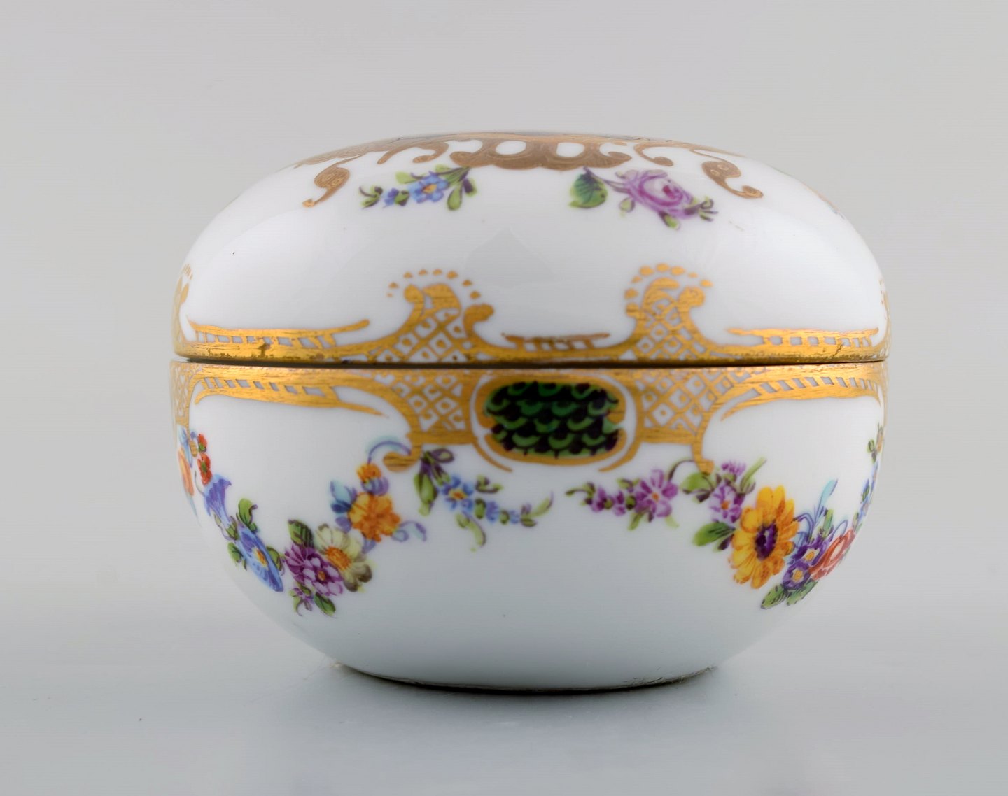 Antik Meissen lågkrukke i håndmalet porcelæn med romantisk scene og gulddekoration. 1800-tallet. Måler: 9 x 6,5 cm. I flot stand. 2. Sortering. Stemplet.