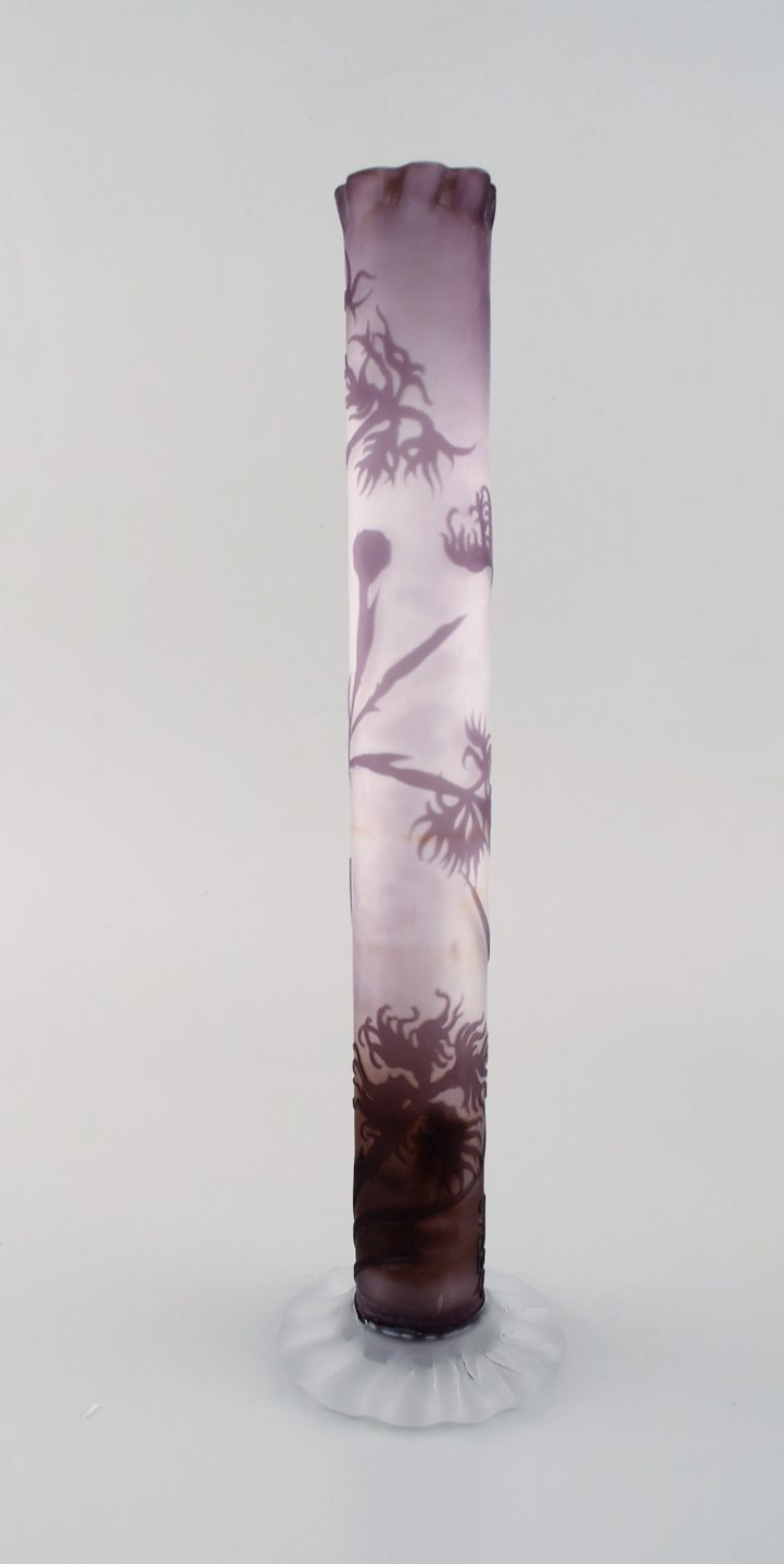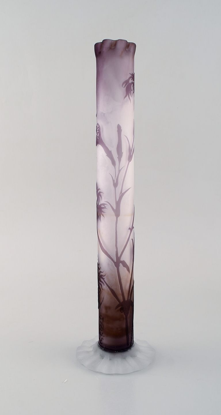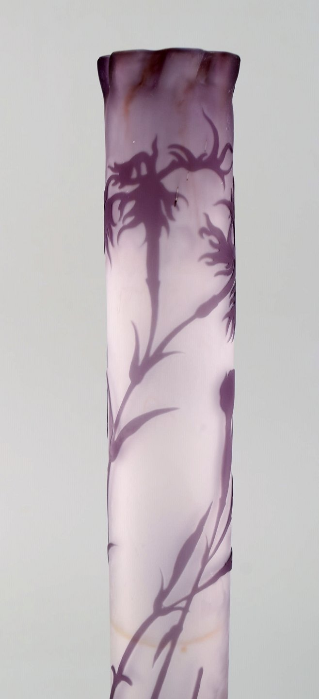 Rare and early Emile Gallé vase in frosted and purple art glass with carved with motifs in the form of flowers and foliage. 1880 / 90's. Measures: 30 x 8 cm. In very good condition. Japanism signature.