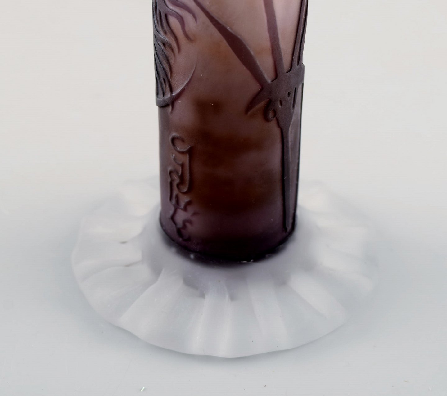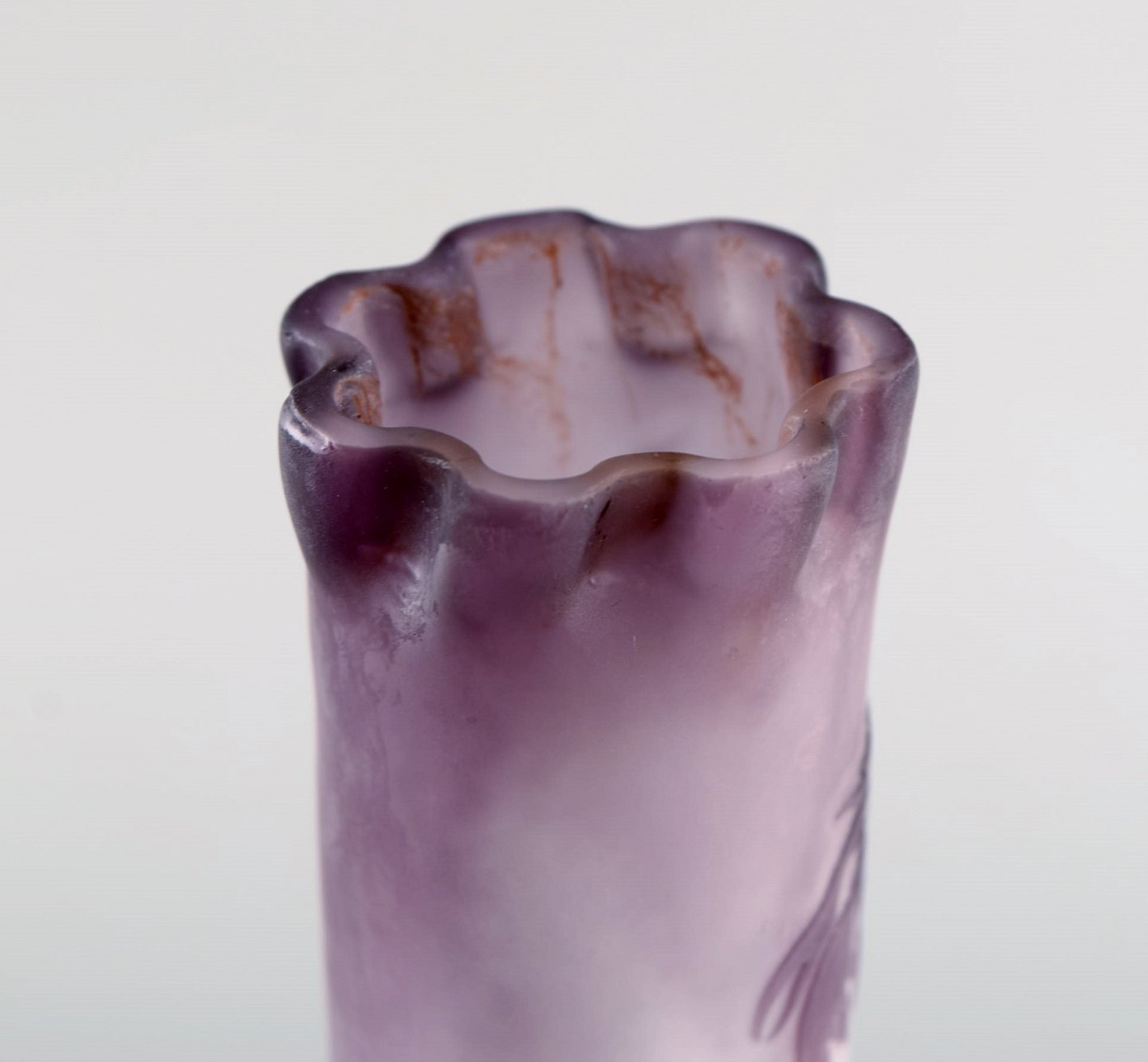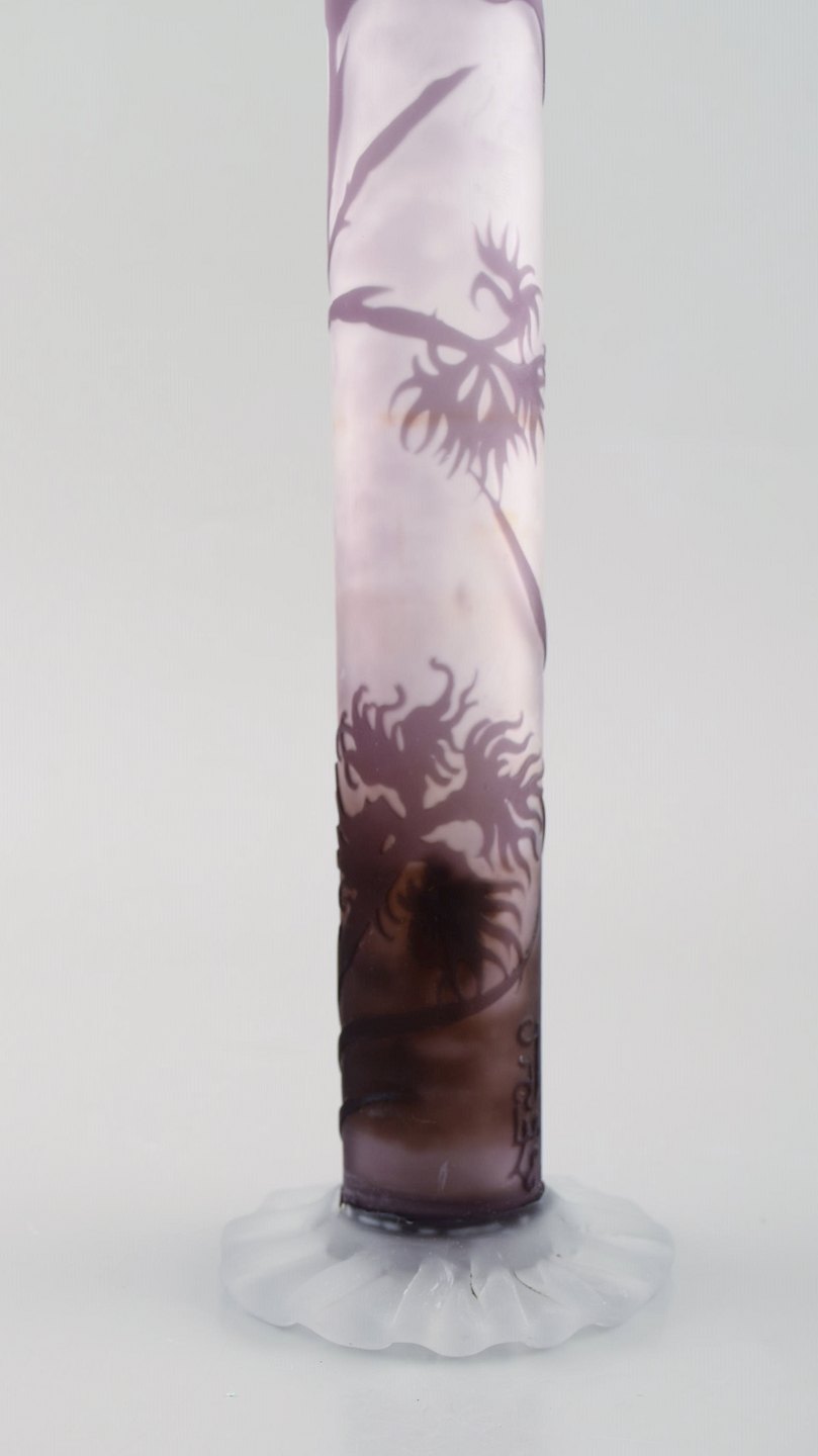 Rare and early Emile Gallé vase in frosted and purple art glass with carved with motifs in the form of flowers and foliage. 1880 / 90's. Measures: 30 x 8 cm. In very good condition. Japanism signature.