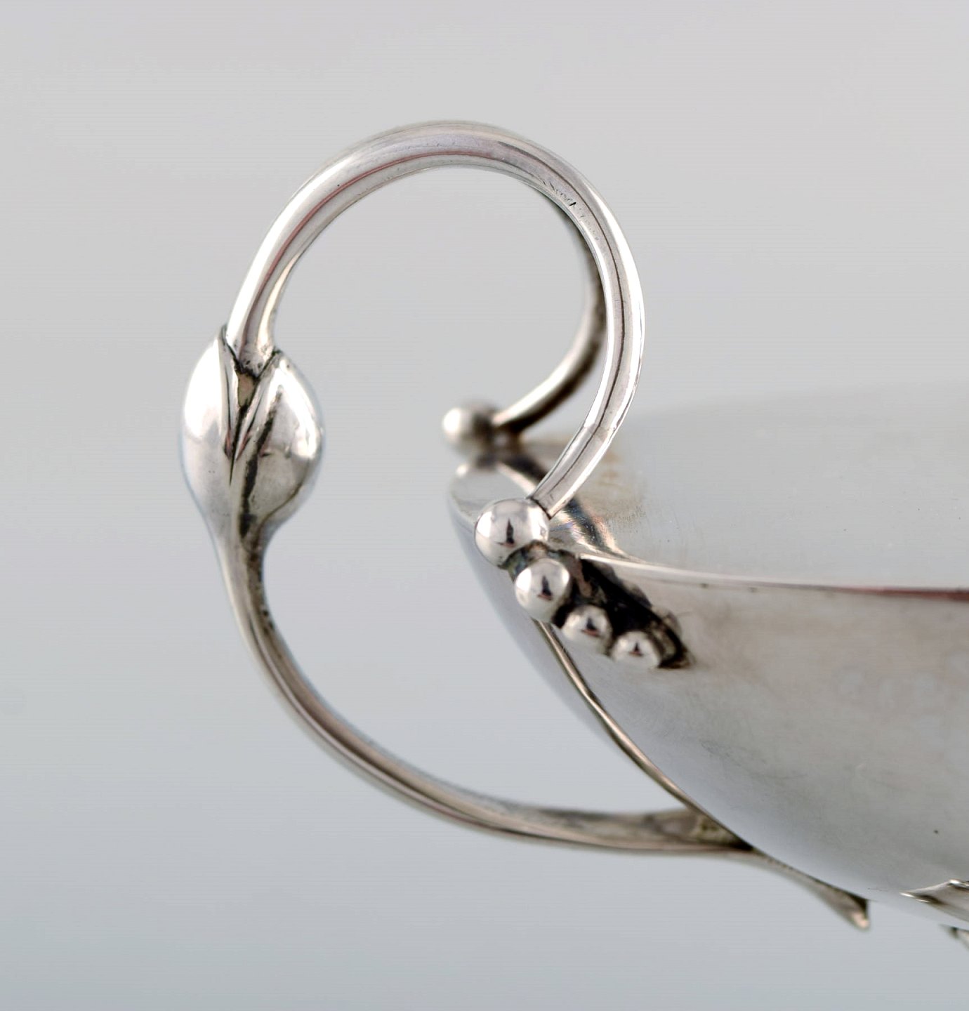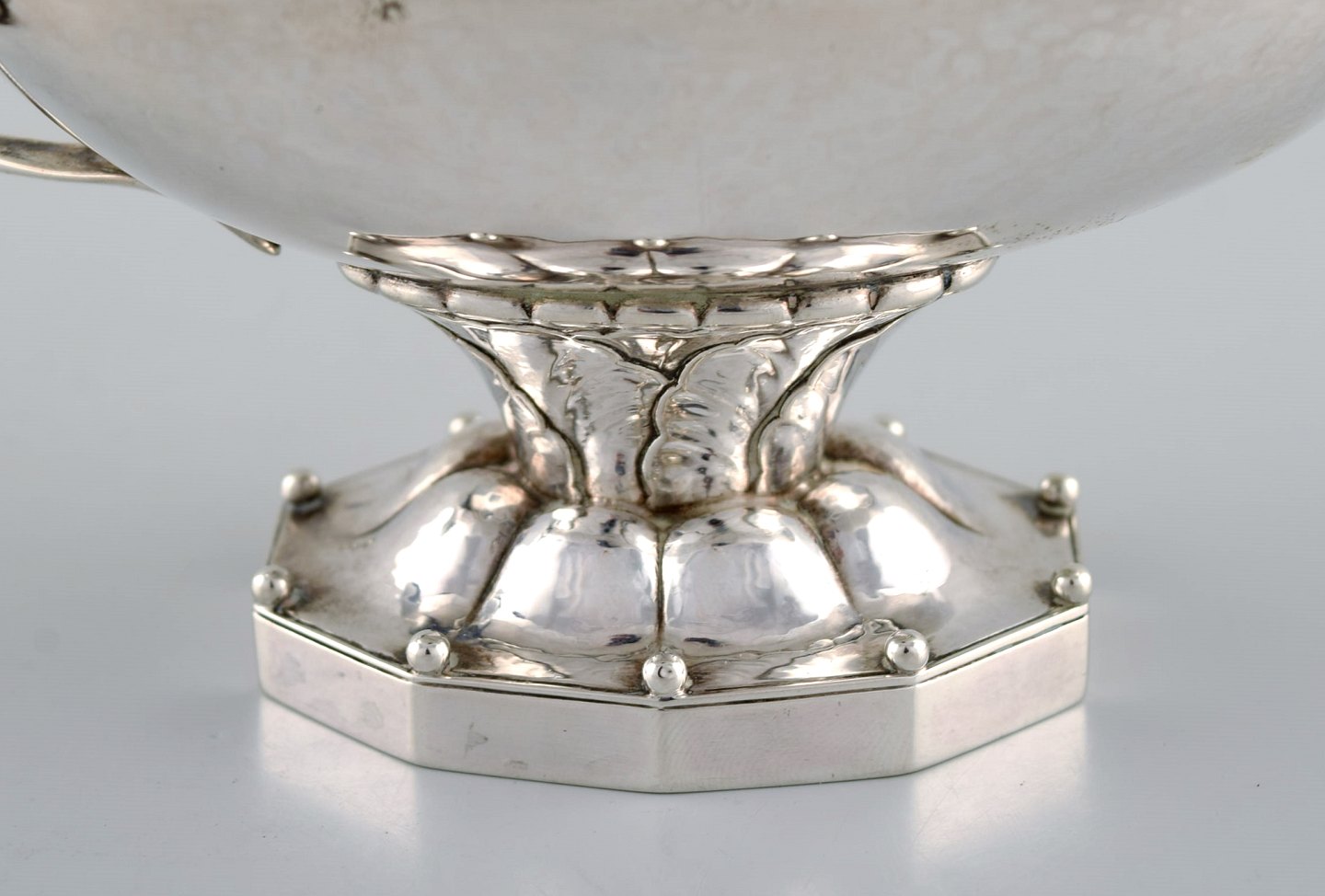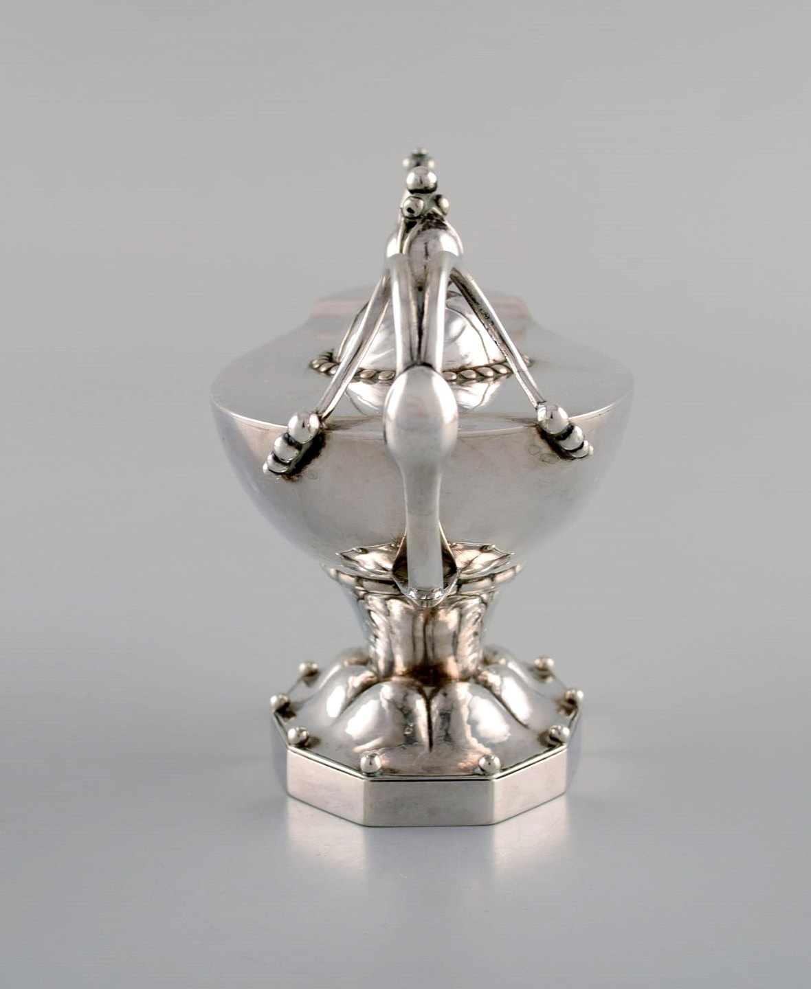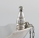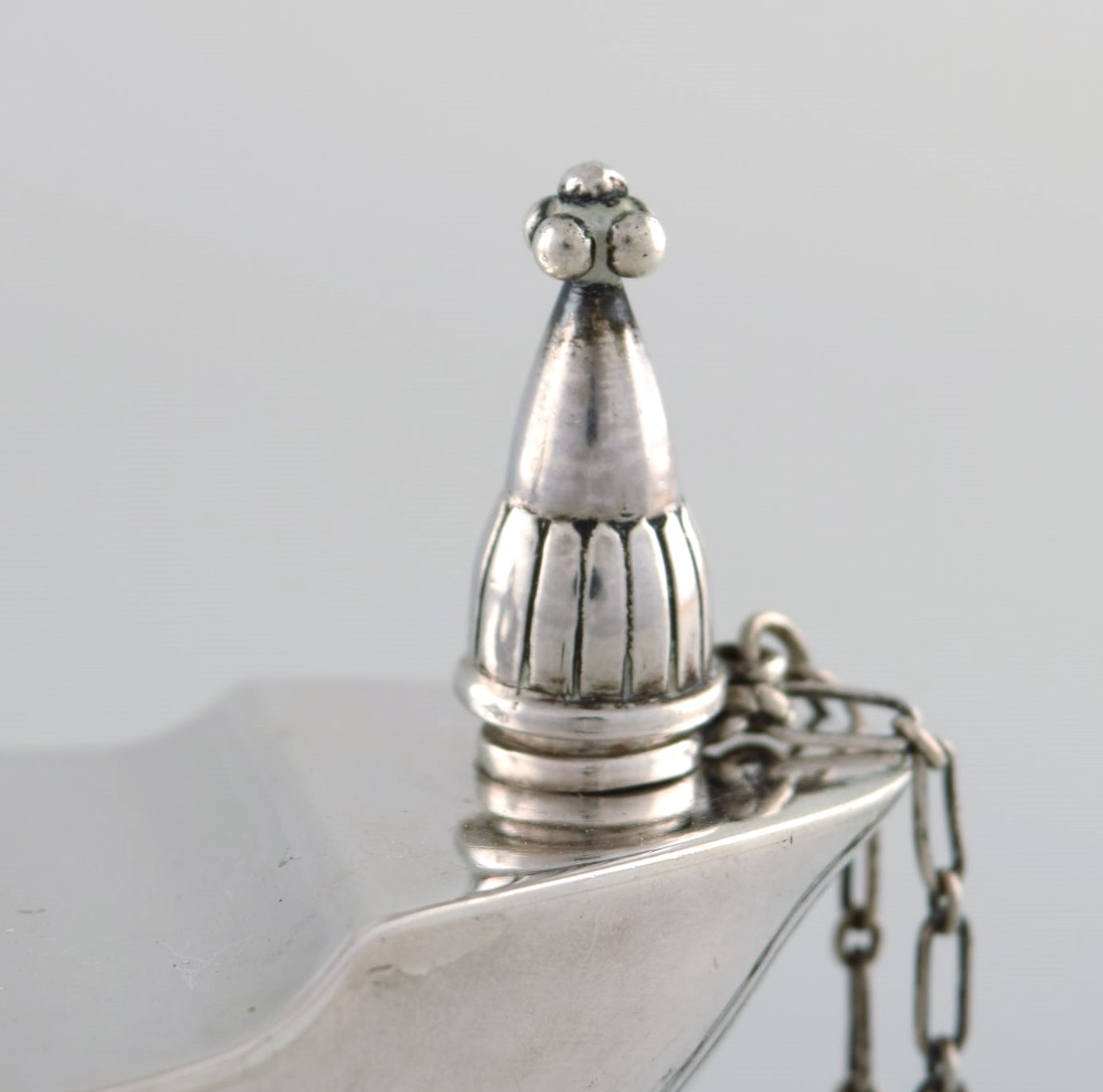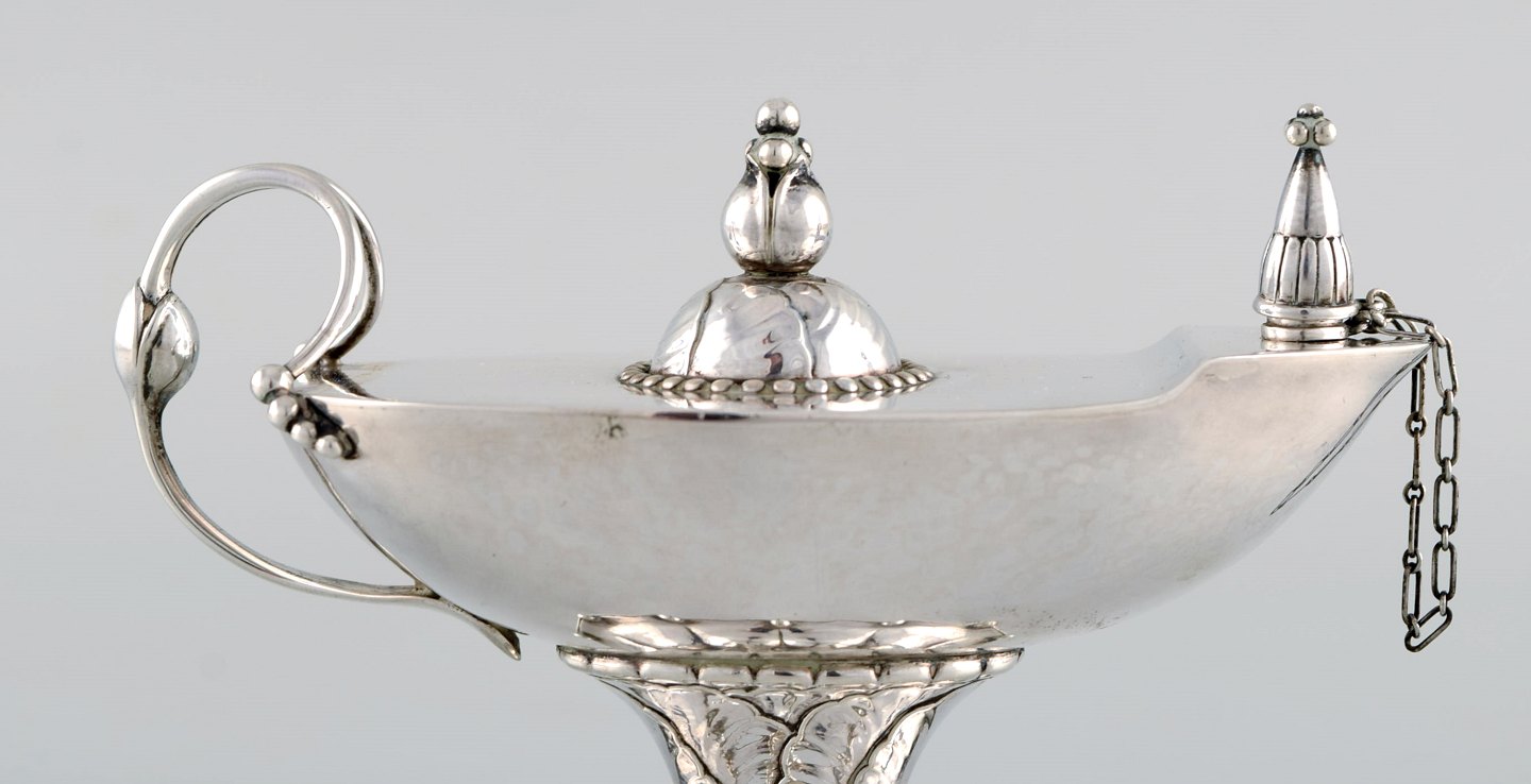 Tidlig Georg Jensen olielampe af sterling sølv. Låg og stamme med bladværk. Kantet fodstykke med perler. Dessin 12. Dateret 1933-44.