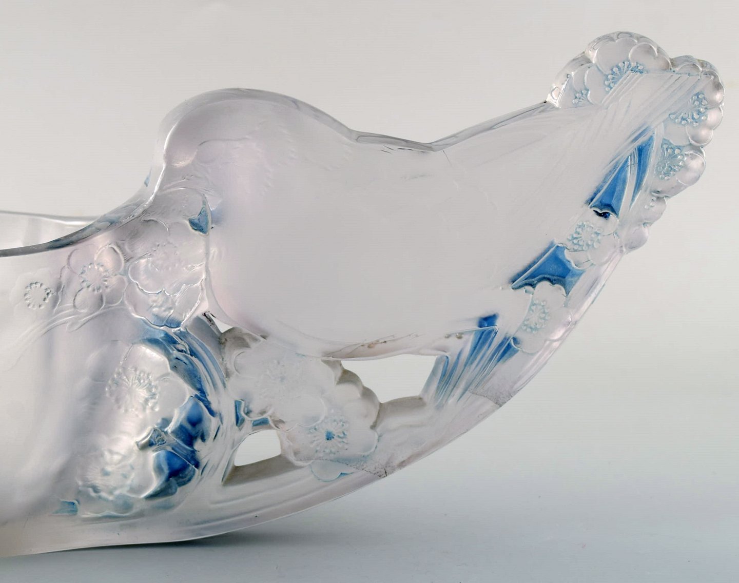 Early and rare René Lalique "Mésanges" jardiniere in art glass with birds. Model 420. Ca 1931. Measures: 53 x 13.5 cm. Stamped: R. LALIQUE, FRANCE In VERY good condition.
