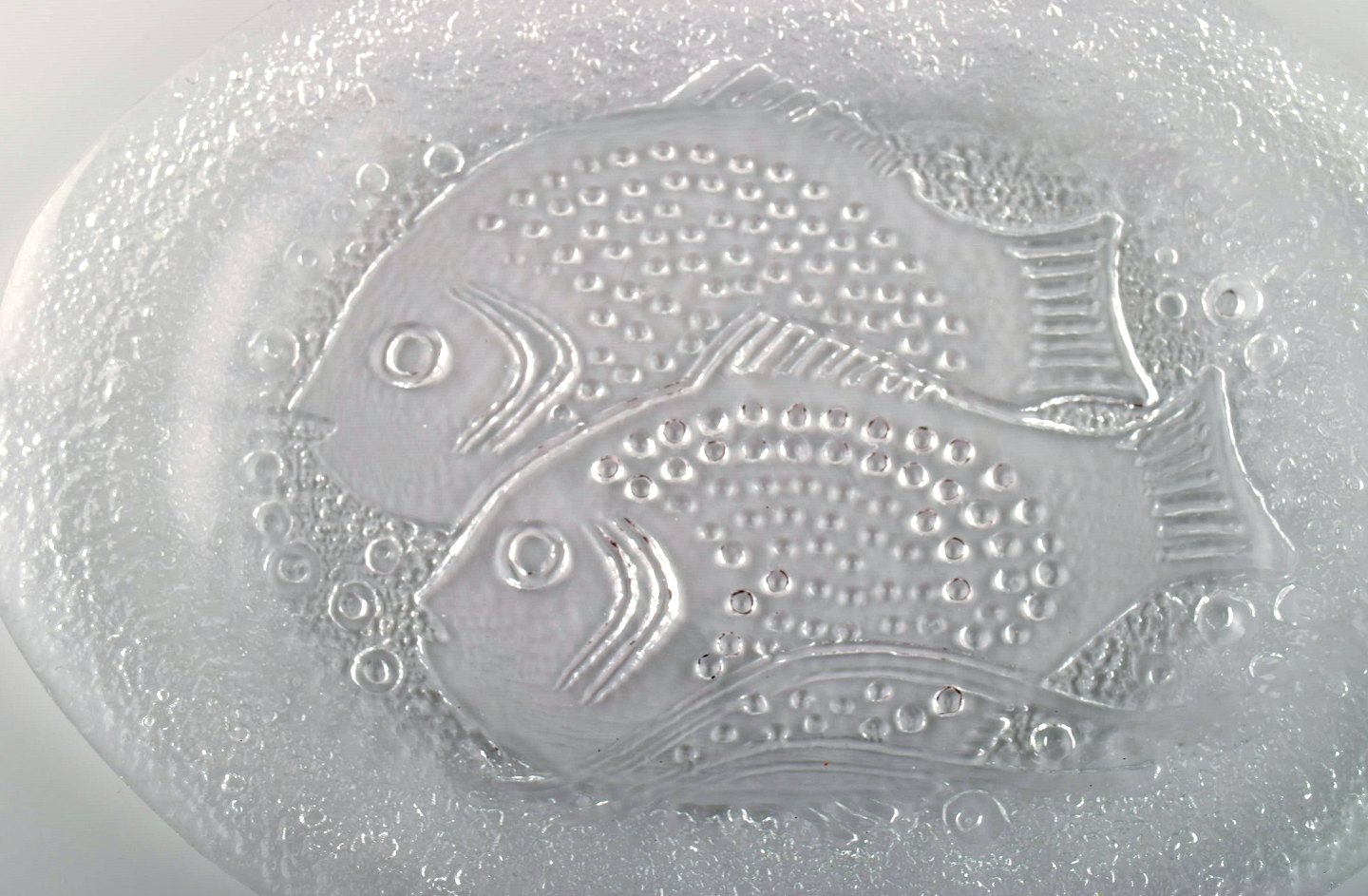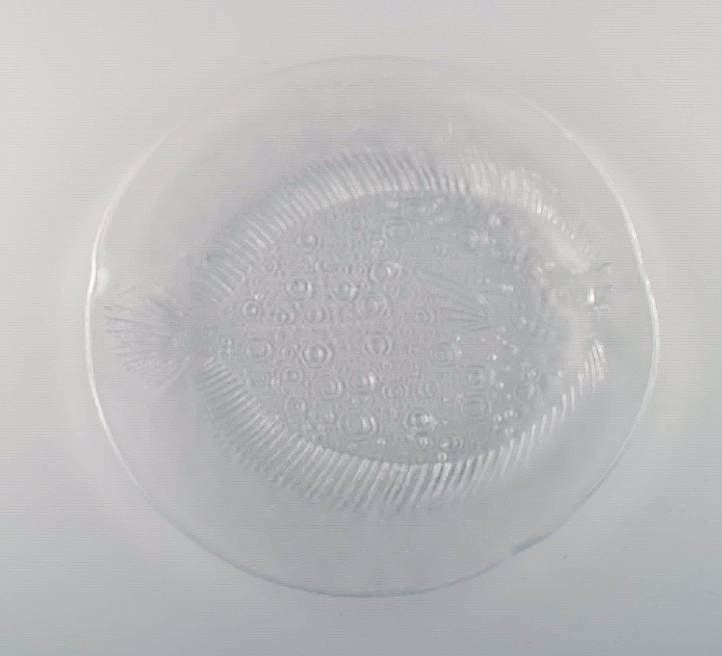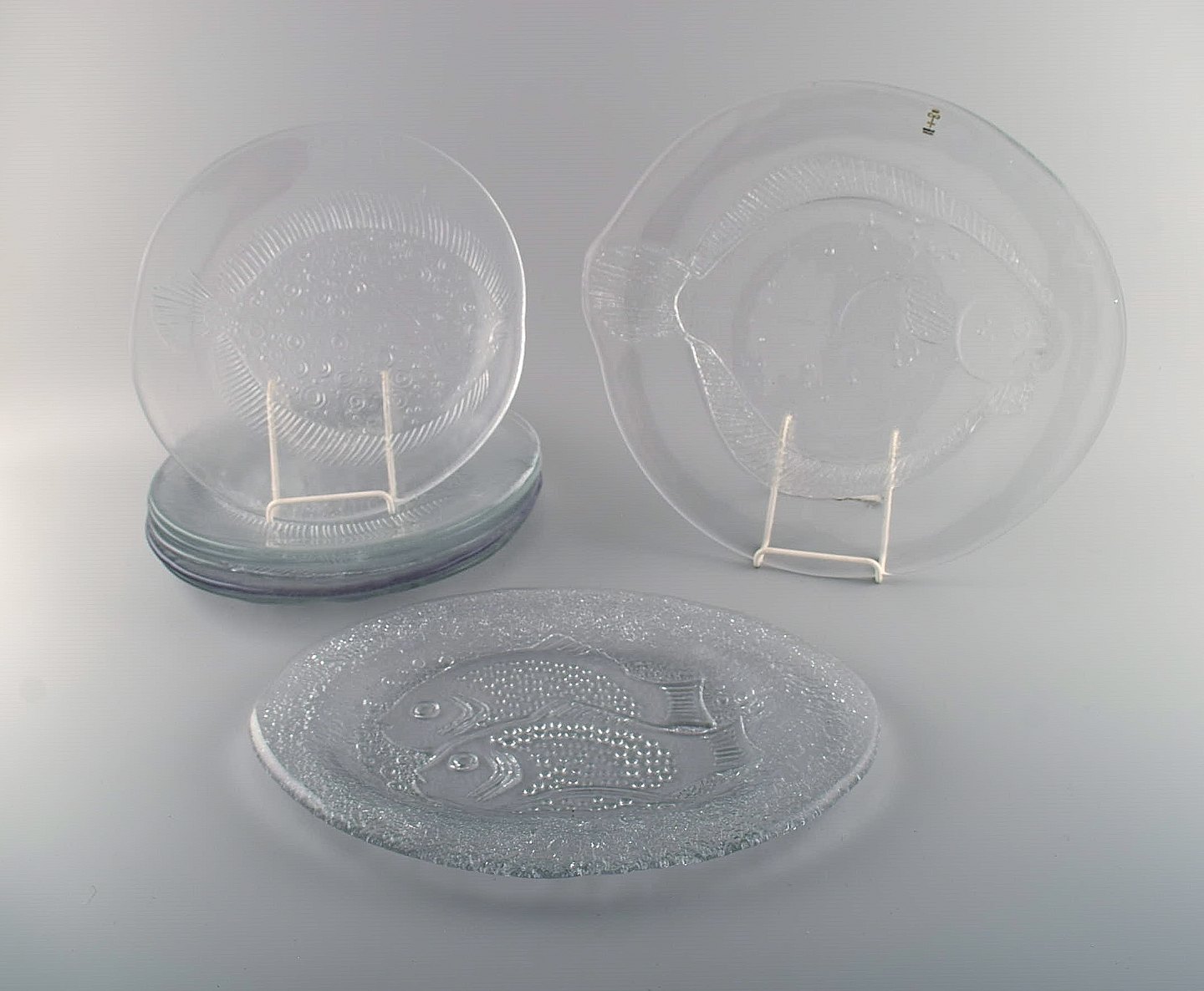Svensk glaskunst. Seks tallerkener og to fade med fiskemotiver. 1980'erne. Største fad måler: 31,5 cm. tallerken måler: 25,5 cm. I flot stand.