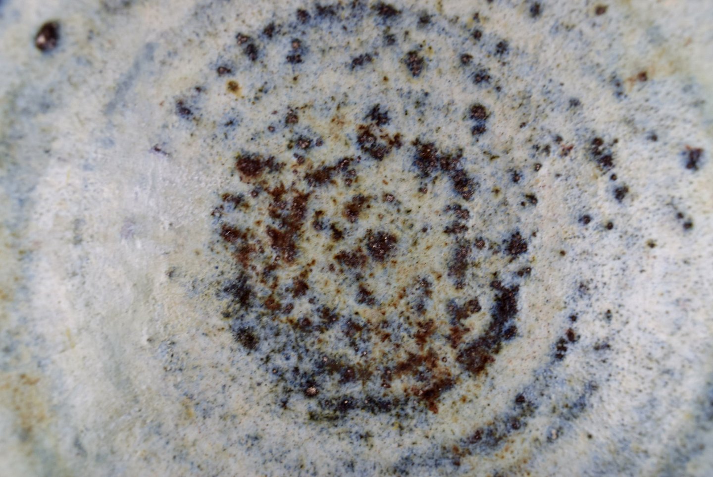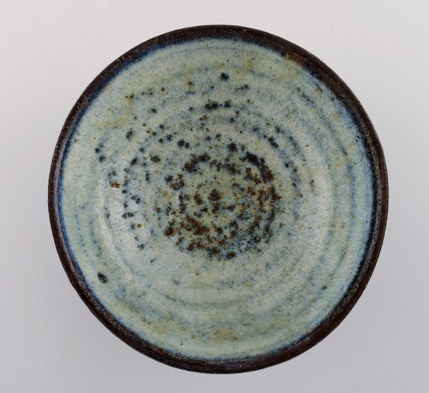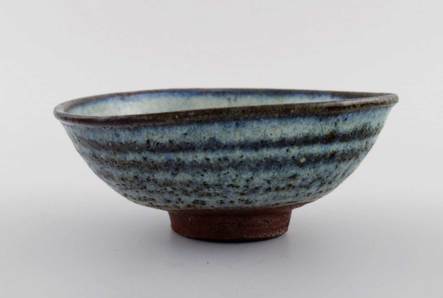 Gutte Eriksen, eget værksted. Skål på fod i glaseret stentøj. Rakubrændt teknik. 1960´erne.