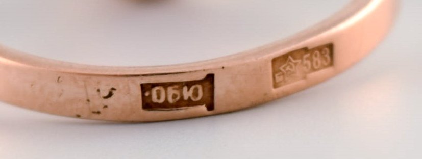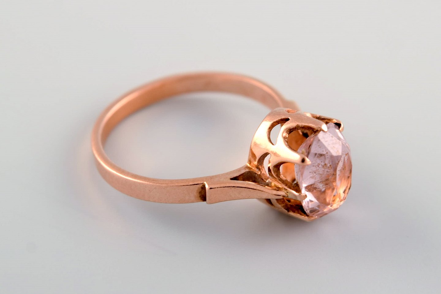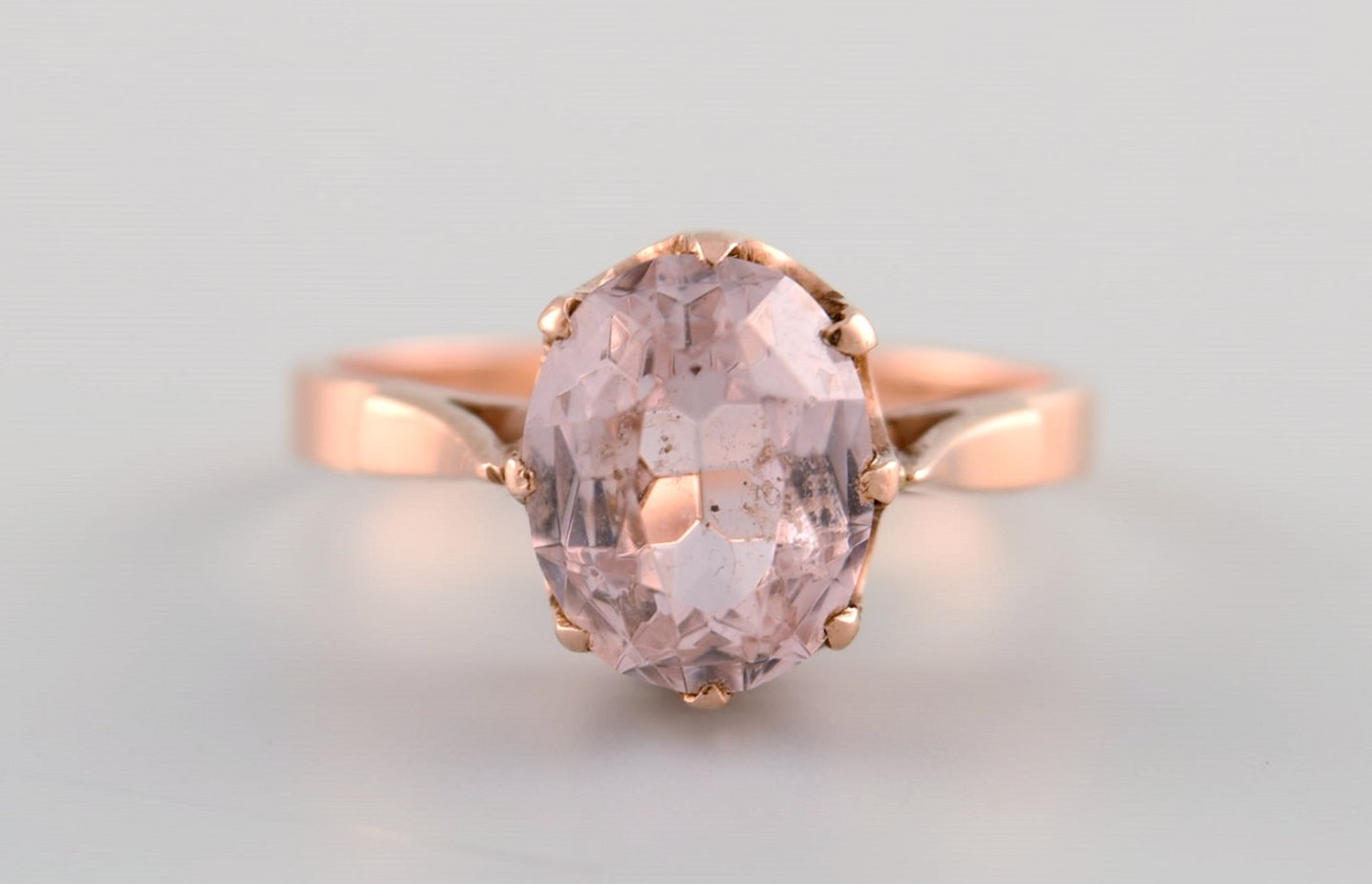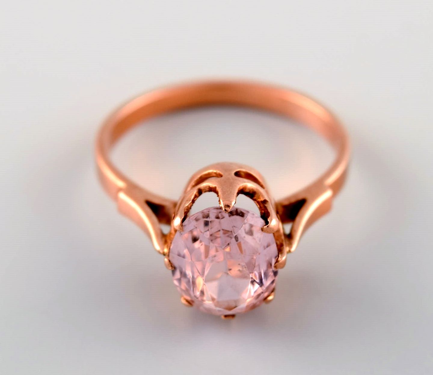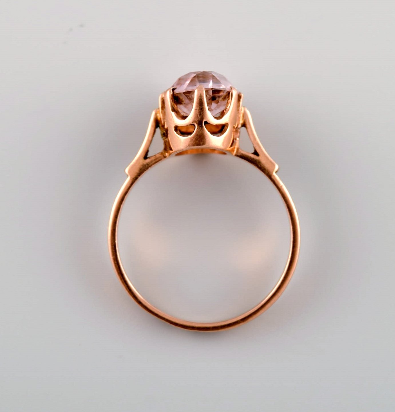 Vintage art deco ring i 14 karat guld prydet med stor pink halvædelsten. 1940'erne. Diameter: 18 mm. I flot stand. Stemplet. I de fleste tilfælde kan vi mod et gebyr (kr. 300) pr ring, få ændret størrelsen.