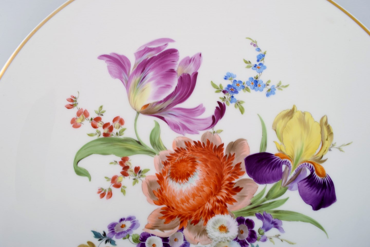 Stort rundt Meissen fad i håndmalet porcelæn med blomster. 1900-tallet. Diameter: 35,5 cm. I flot stand. Stemplet.