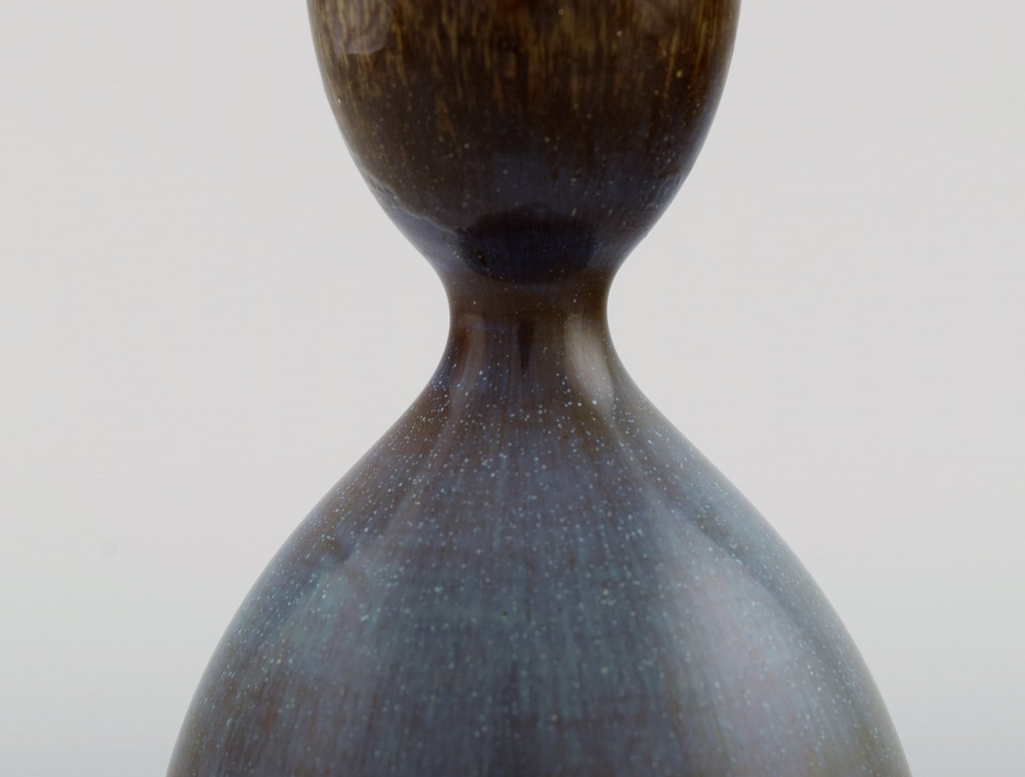 Stig Lindberg for Gustavsberg Studiohand. Vase i glaseret keramik. Smuk glasur i blå og brune nuancer. Sjælden form. Midt 1900-tallet. Måler: 18,5 x 9,5 cm. Stemplet. I god stand.