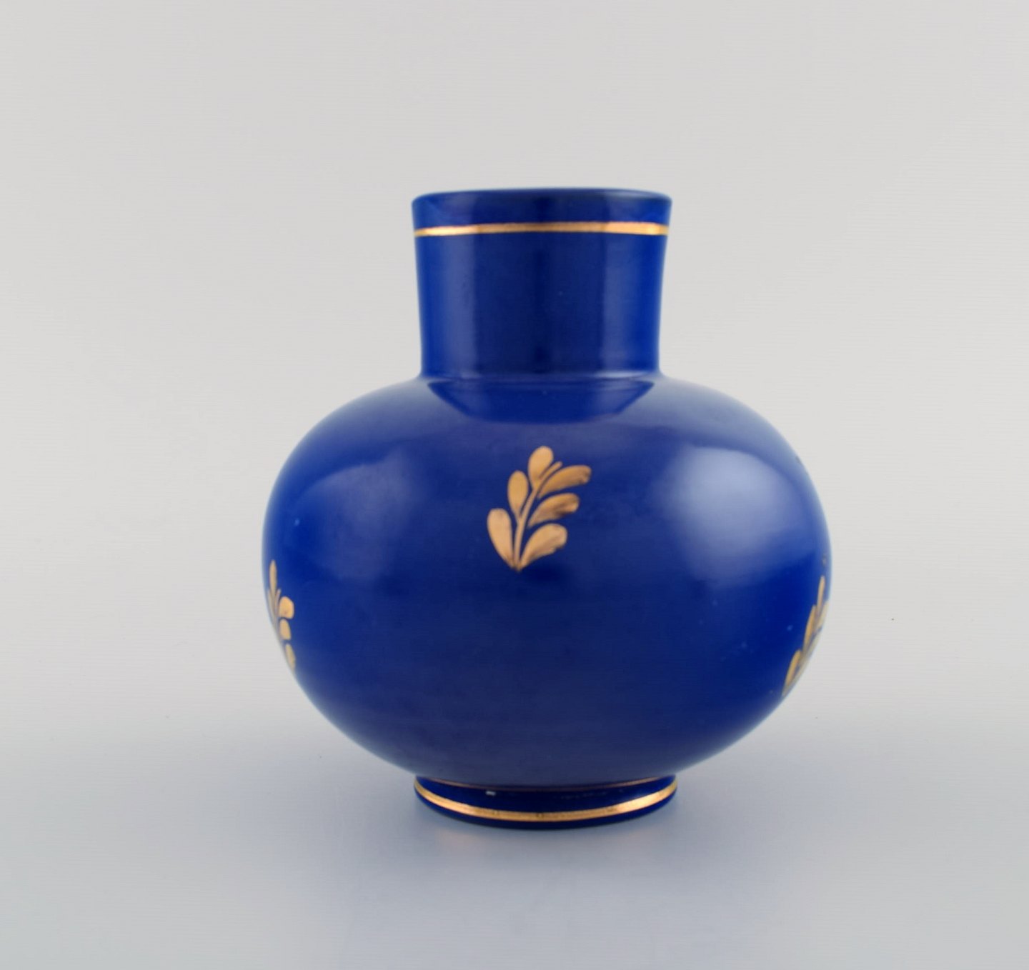 Nittsjö, Sweden. Vase in glazed ceramics. Blue glaze and leaves in gold. 1960's. Stamped. Measures: 12,5 x 12 cm. In very good condition.
