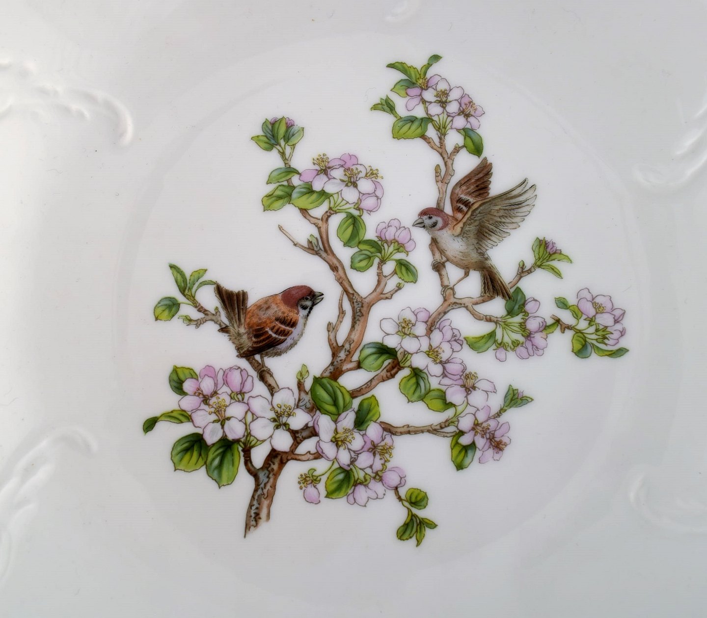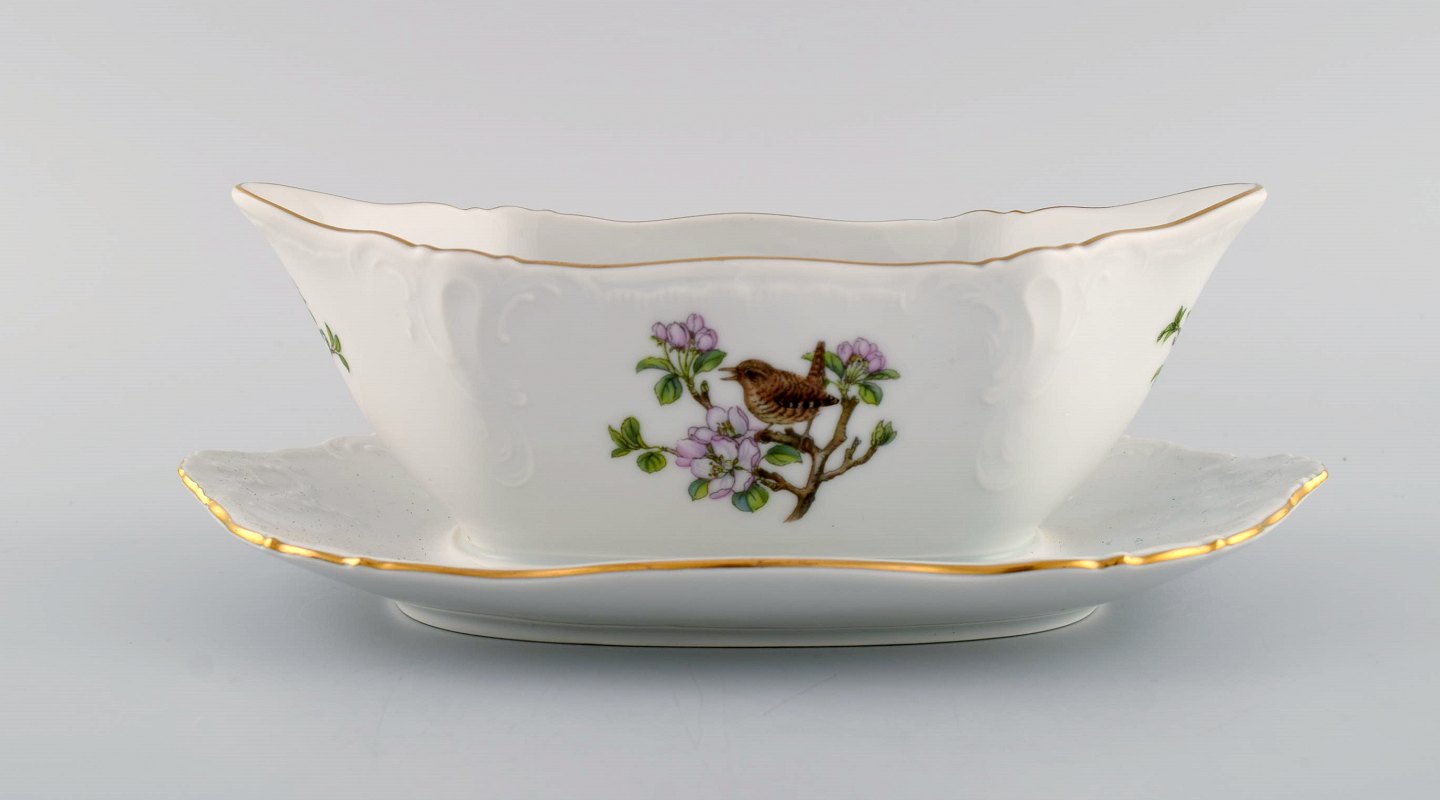 Royal Copenhagen "Forår" sovseskål og skål i porcelæn med motiver af fugle og bladværk. 1980'erne. Sovseskålen måler: 24 x 8,5 cm. Skålen måler: 21,5 x 5,5 cm. I flot stand. Stemplet.