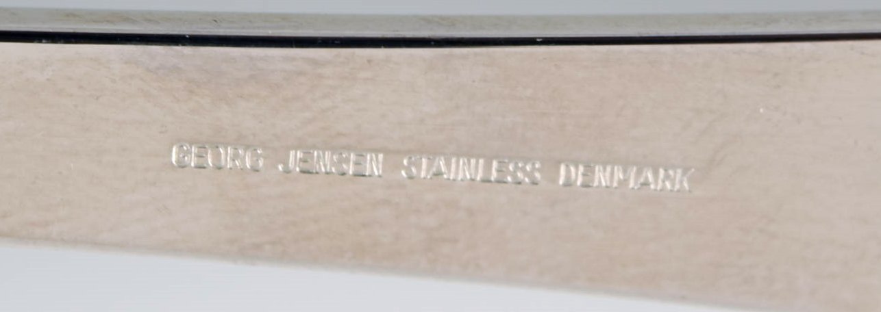 Henning Koppel for Georg Jensen. Strata serveringsske i rustfrit stål og cremefarvet plast. 1960/70'erne. 2 stk på lager. Længde: 21 cm. I flot stand. Stemplet.