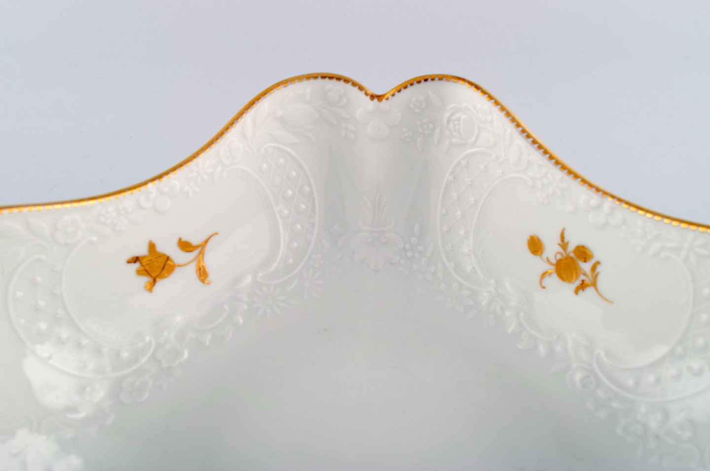 Meissen skål i porcelæn med blomster og bladværk i relief og gulddekoration. 1900-tallet. To stk på lager.