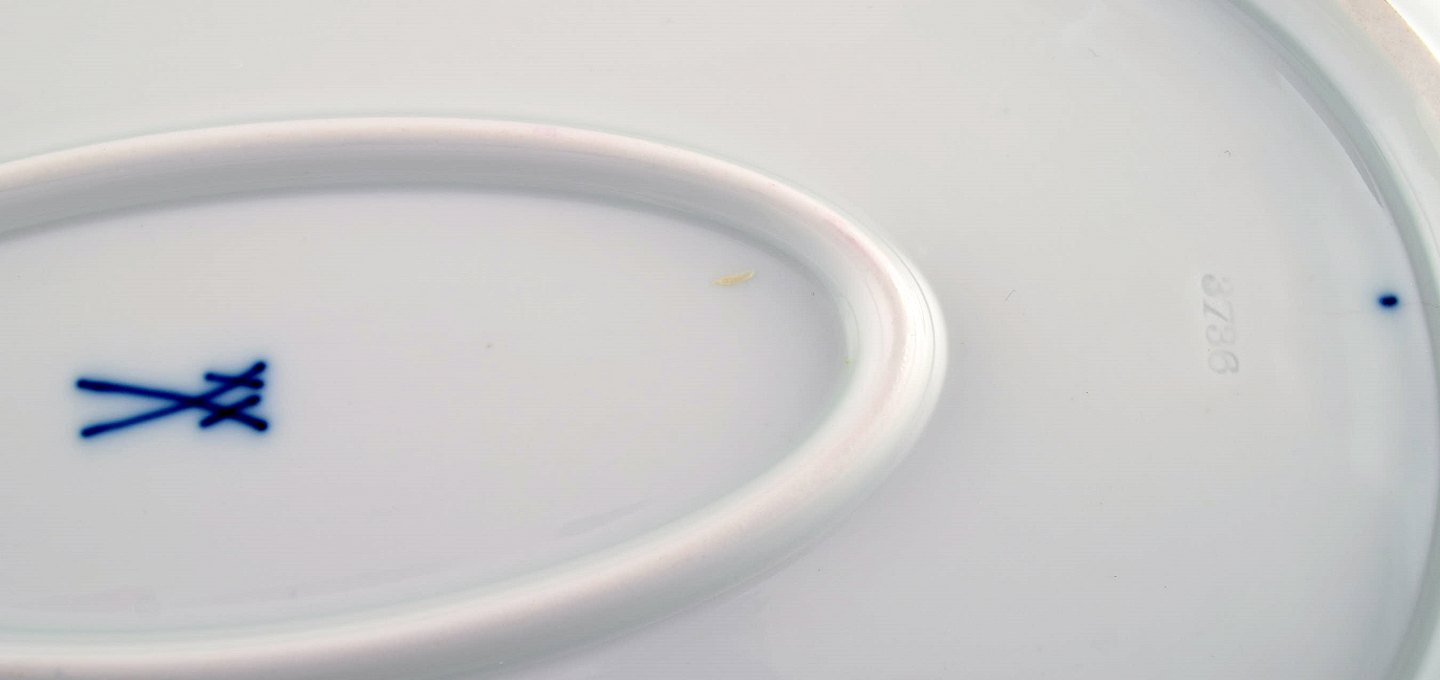 Stort Meissen serveringsfad i porcelæn med blomster og bladværk i relief og gulddekoration. 1900-tallet. To stk på lager. Måler: 37 x 26 x 4 cm. I flot stand. Stemplet.