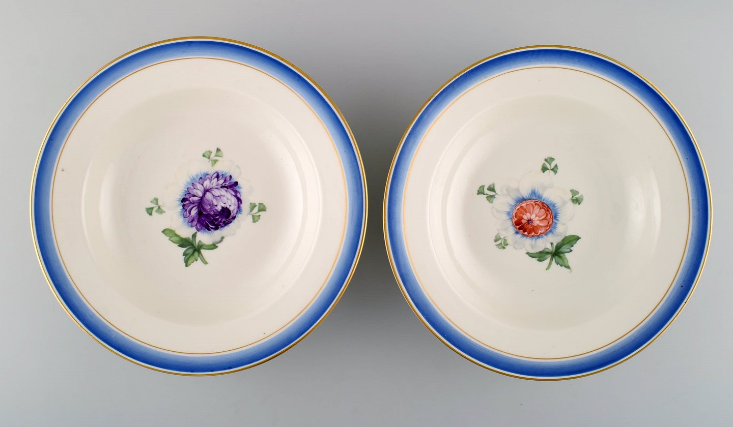 Fem antikke Royal Copenhagen dybe tallerkener i håndmalet porcelæn med blomster og blå kant med guld. Modelnummer 592/9049. Sent 1800-tallet.