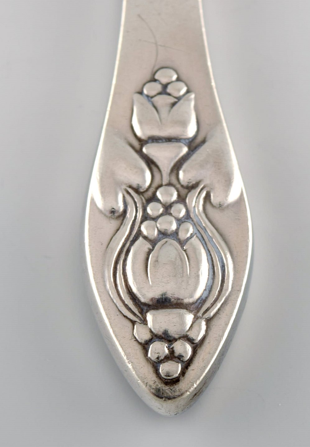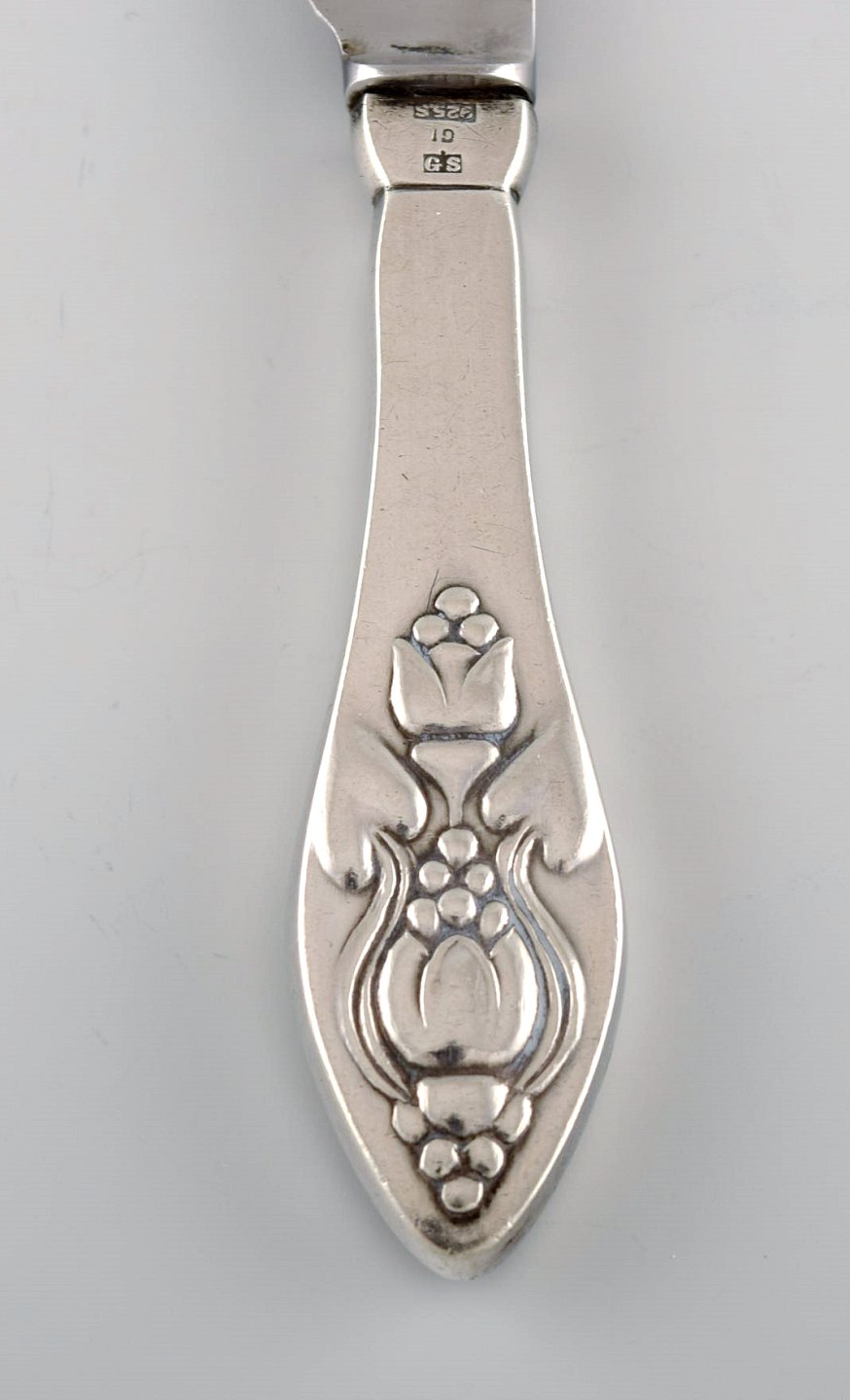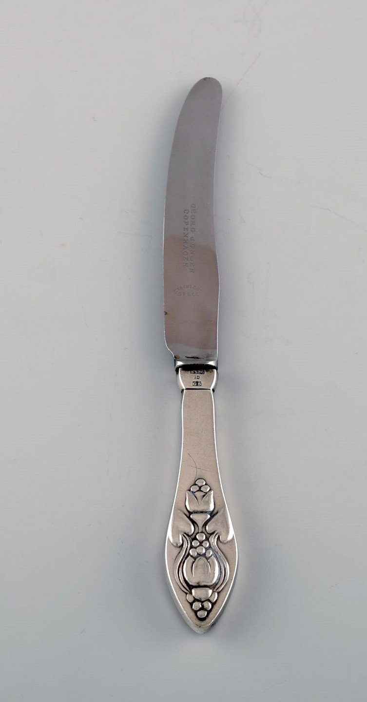 Seks sjældne og antikke Georg Jensen Klokke frokostknive i sterlingsølv og rustfrit stål. 1910'erne. Længde: 16,7 cm. I flot stand. Stemplet.