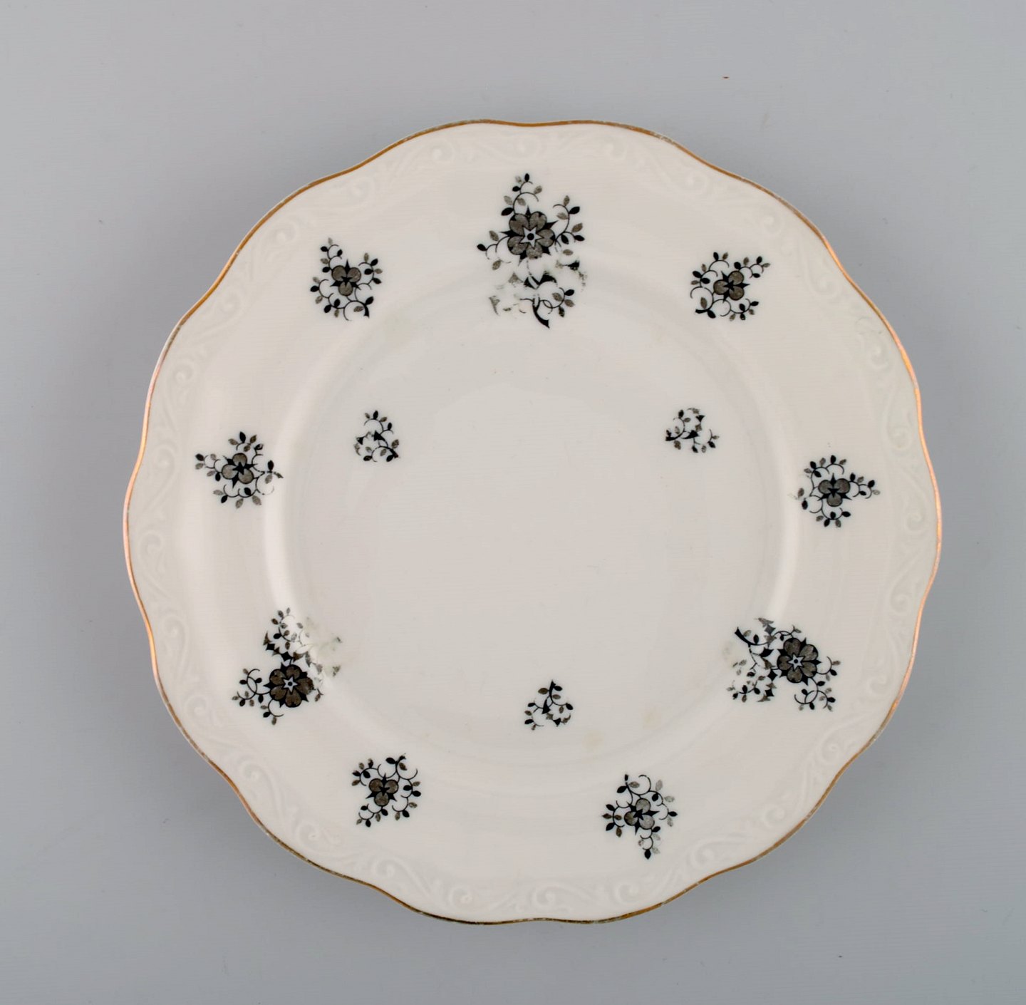KPM, Copenhagen Porcelain Painting. Eight Rubens plates in porcelain with floral motifs, gold edge and scrolls in relief. 1940's.