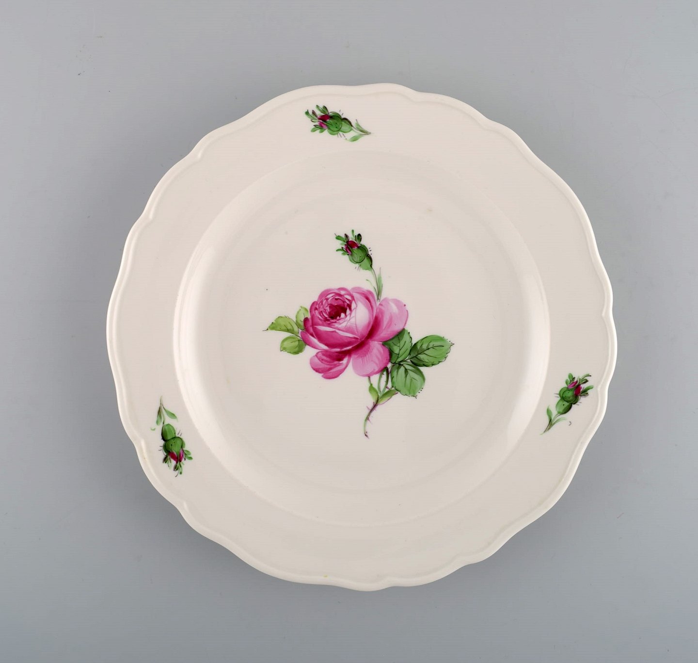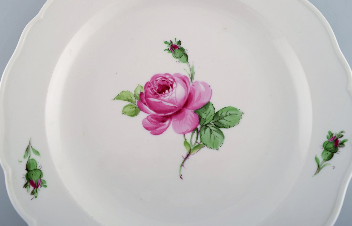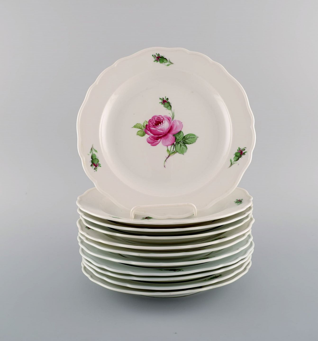 11 antikke Meissen frokosttallerkener i håndmalet porcelæn med lyserøde roser. Tidligt 1900-tallet. Diameter: 21,5 cm. I flot stand. Stemplet. 2. Sortering.
