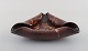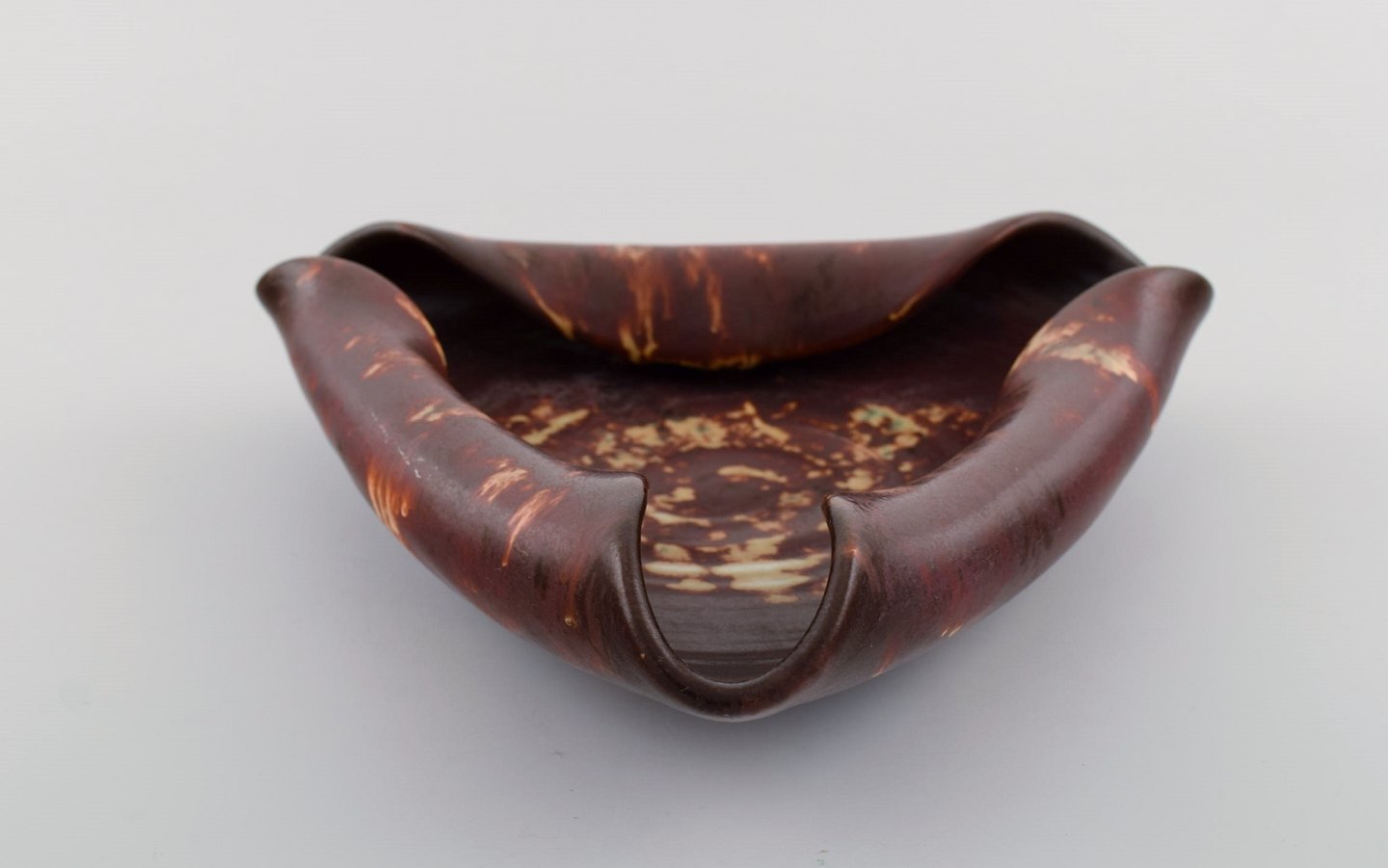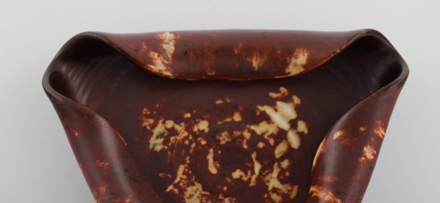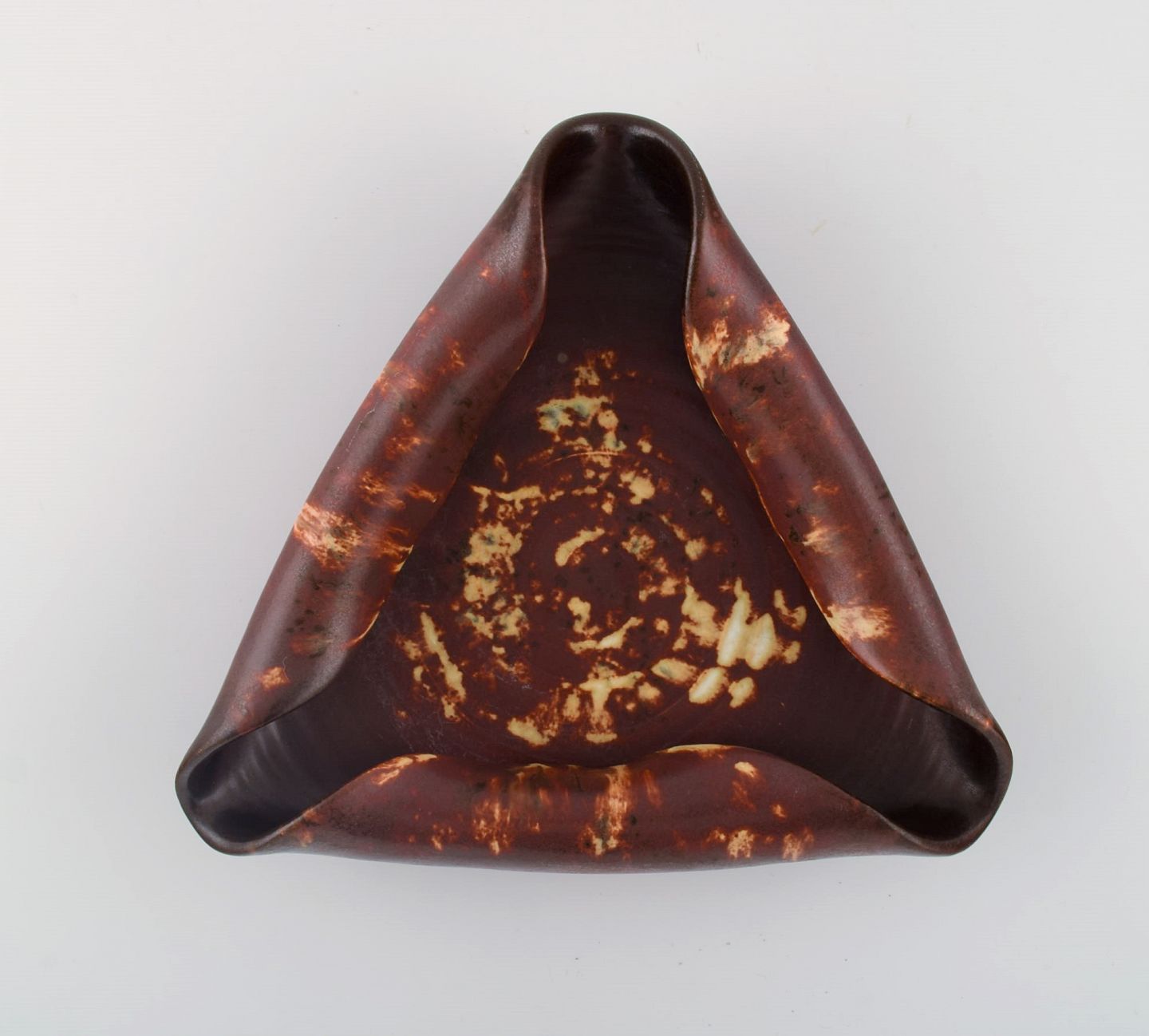 Michael Andersen, Bornholm. Trekantet skål i glaseret keramik. Smuk glasur i røde nuancer. 1960'erne. Måler: 21,5 x 5 cm. I flot stand. Stemplet.