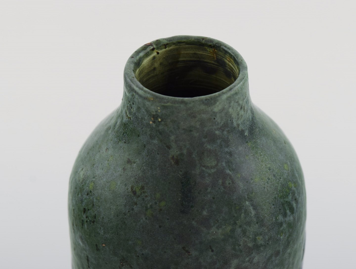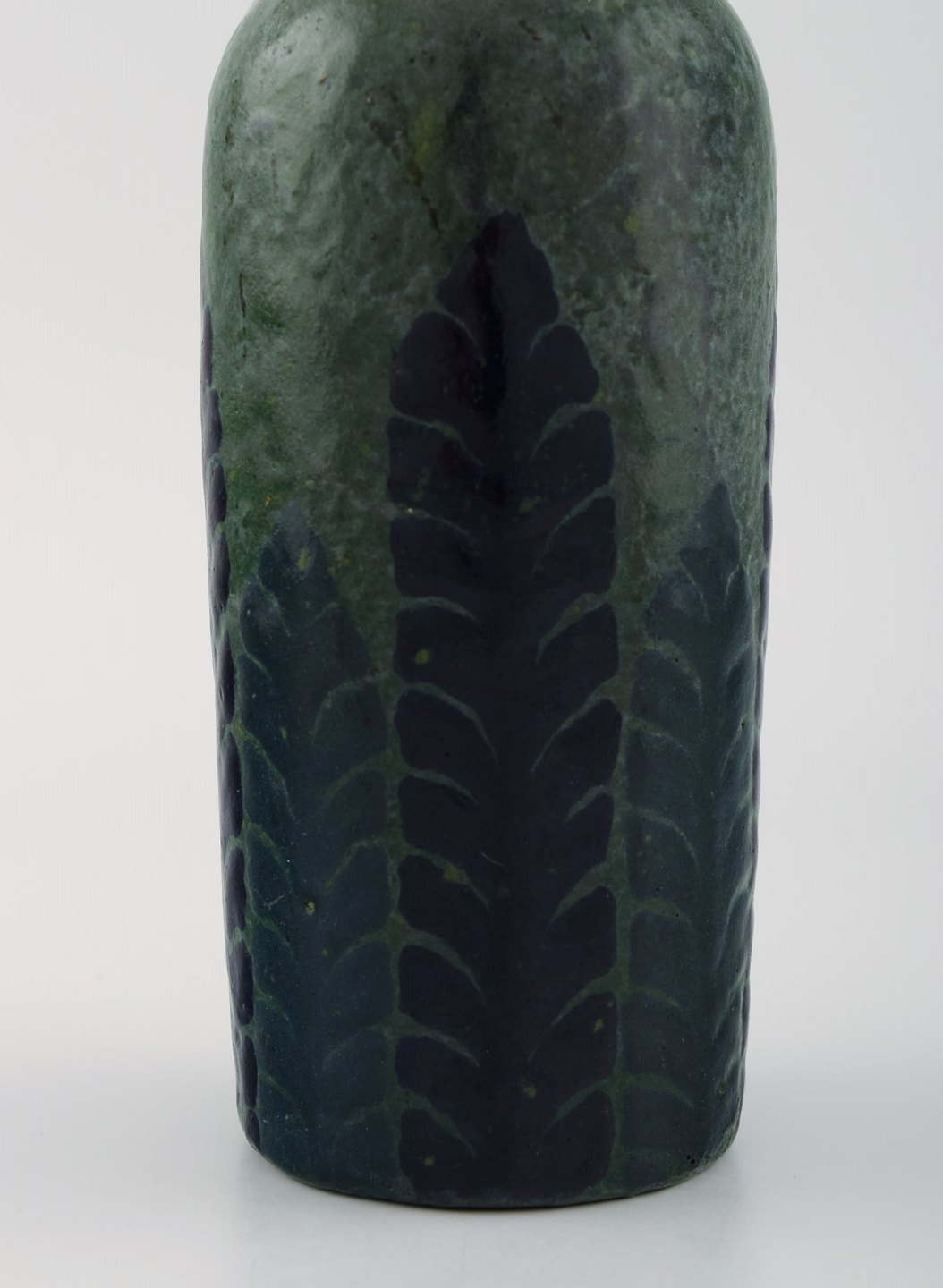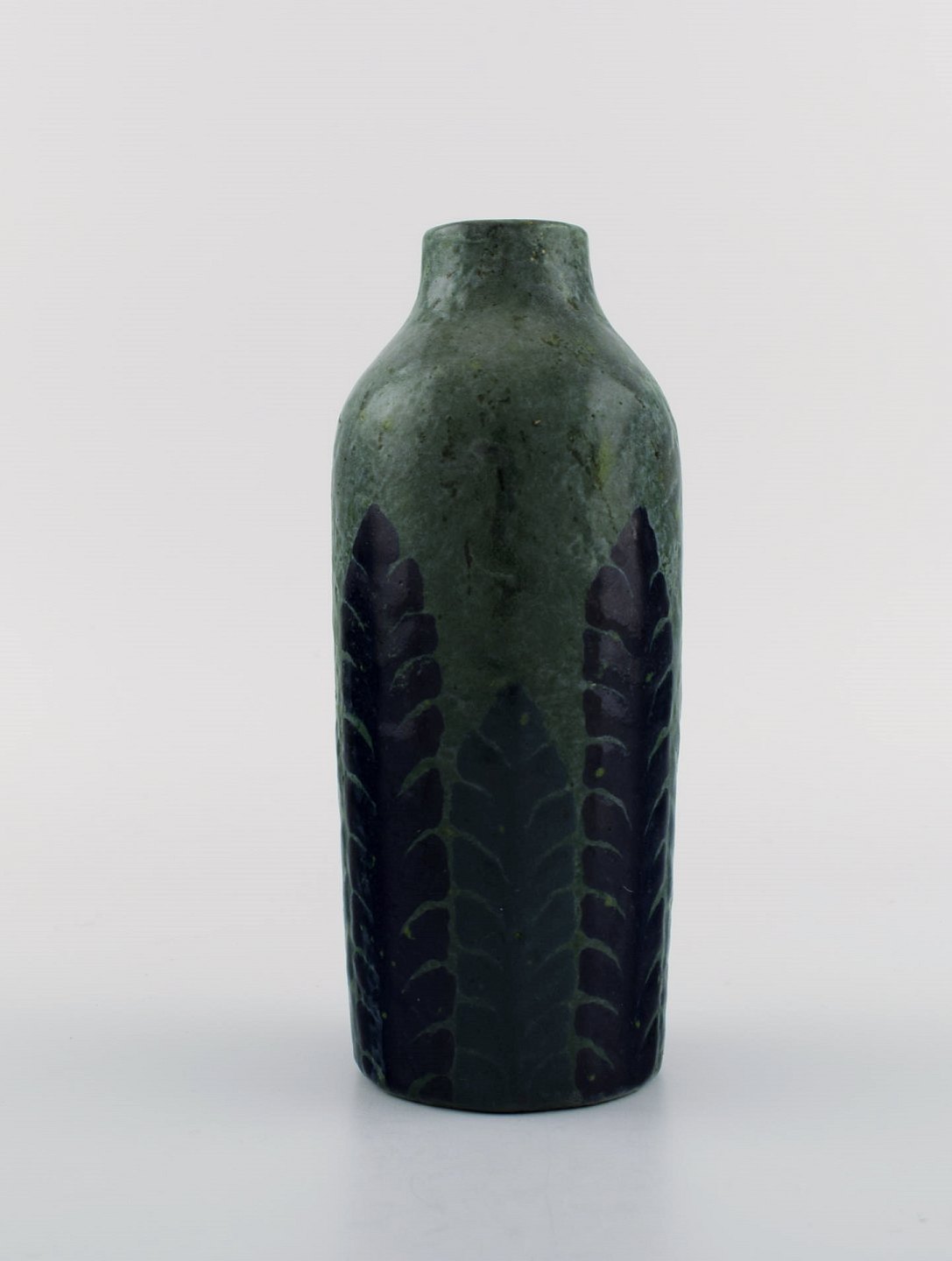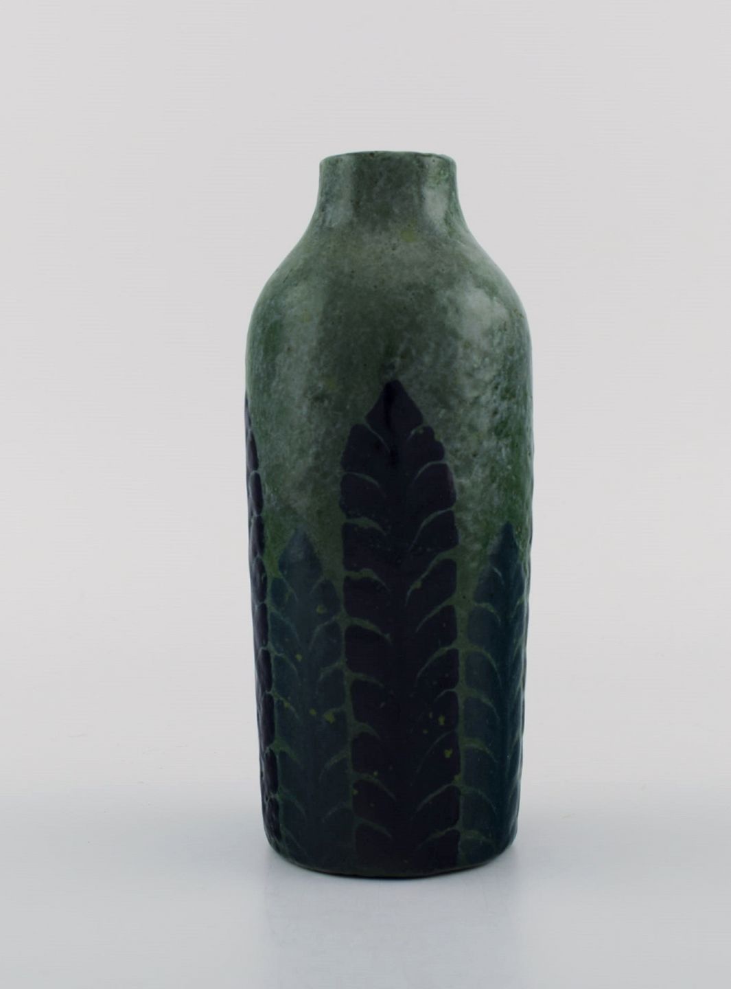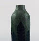 Gunnar Wennerberg for Gustavsberg. Antik unika vase i glaseret keramik. Sorte og blå blade på grøn baggrund. Dateret 1905. Måler: 18 x 7,5 cm. Signeret. I flot stand.