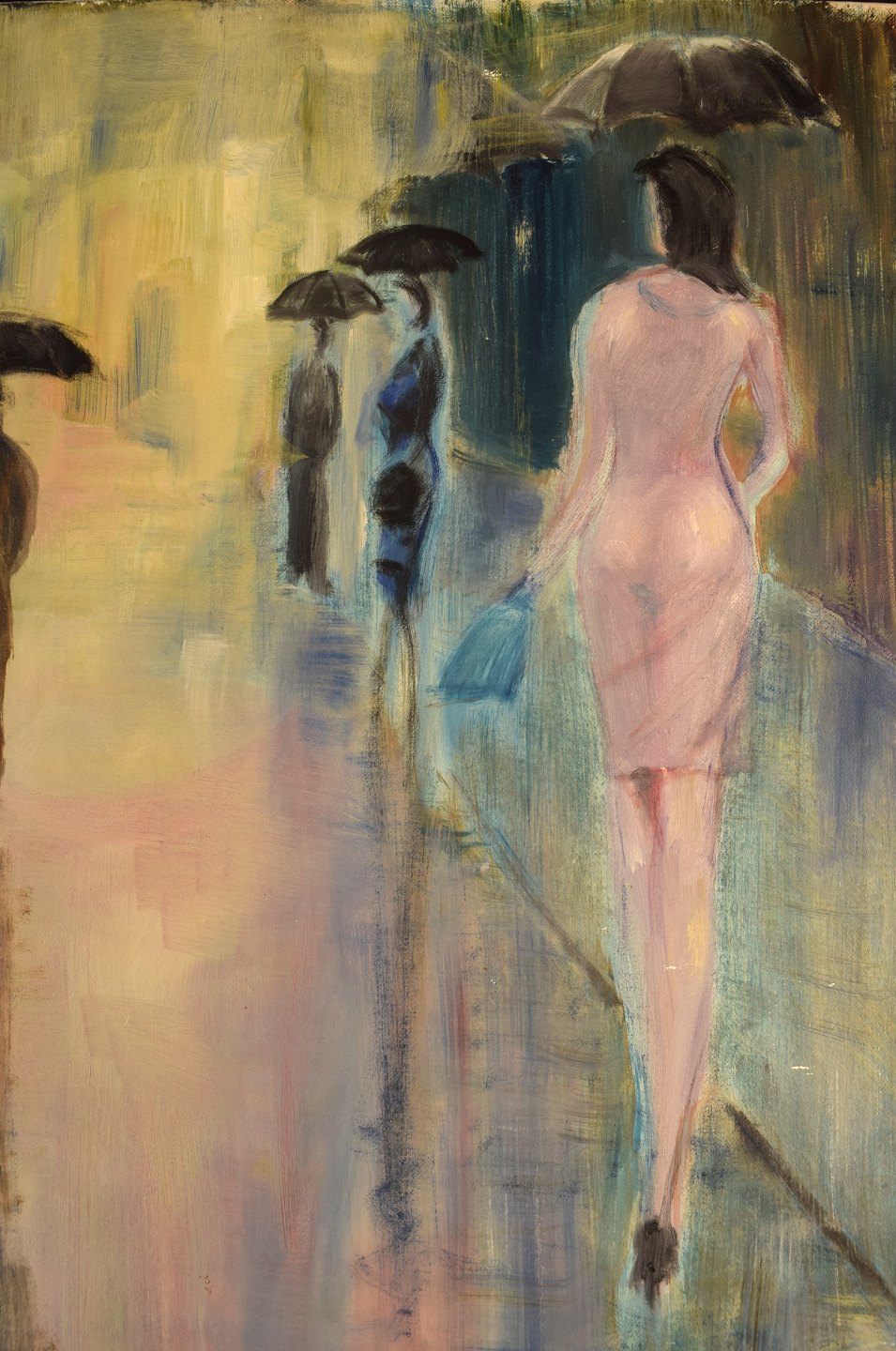 Gios Di Agostini, Italien. Olie på lærred. "Umbrelli No 1". 1980'erne.