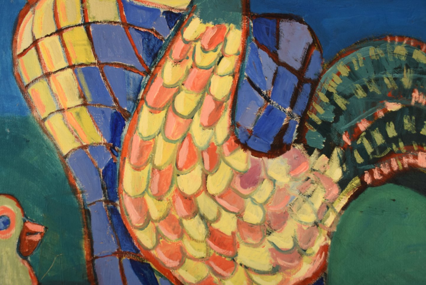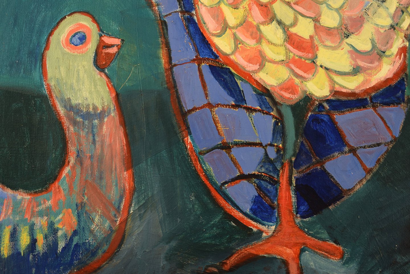 Dansk kunstner. Olie på lærred. "Hane og kylling". Midt 1900-tallet. Lærredet måler: 74 x 64,5 cm. Rammen måler: 1,5 cm. I flot stand. Signeret.